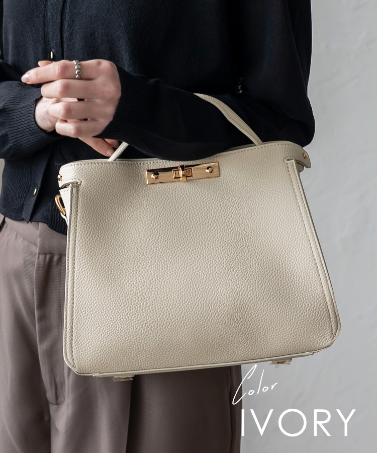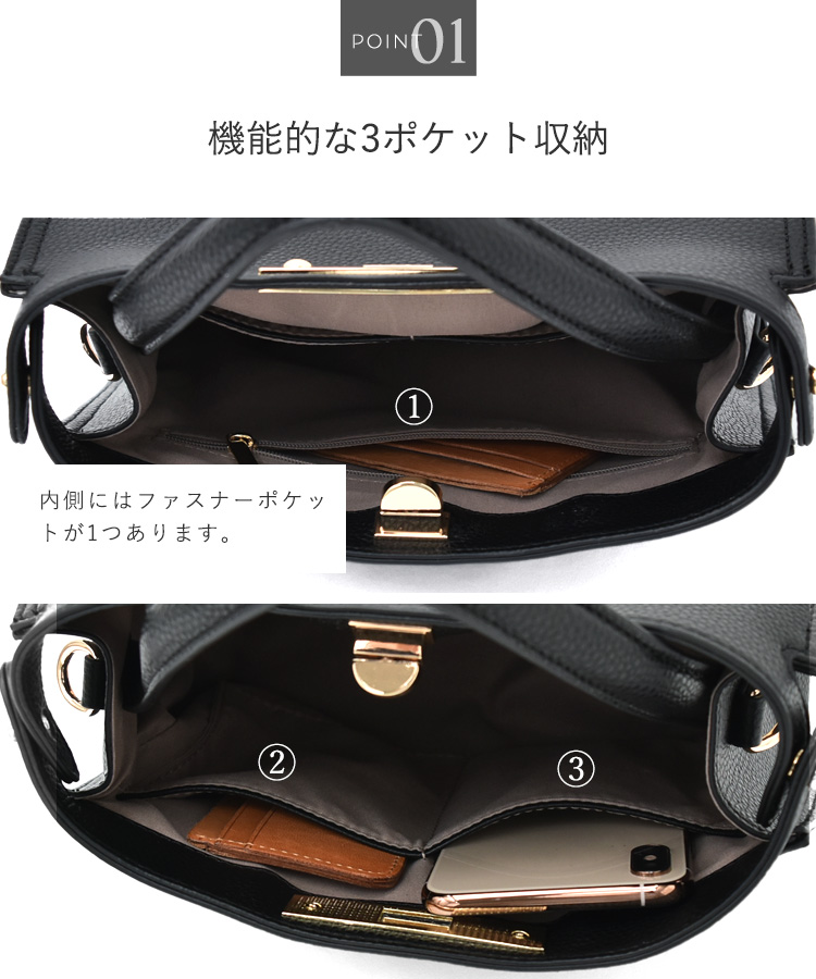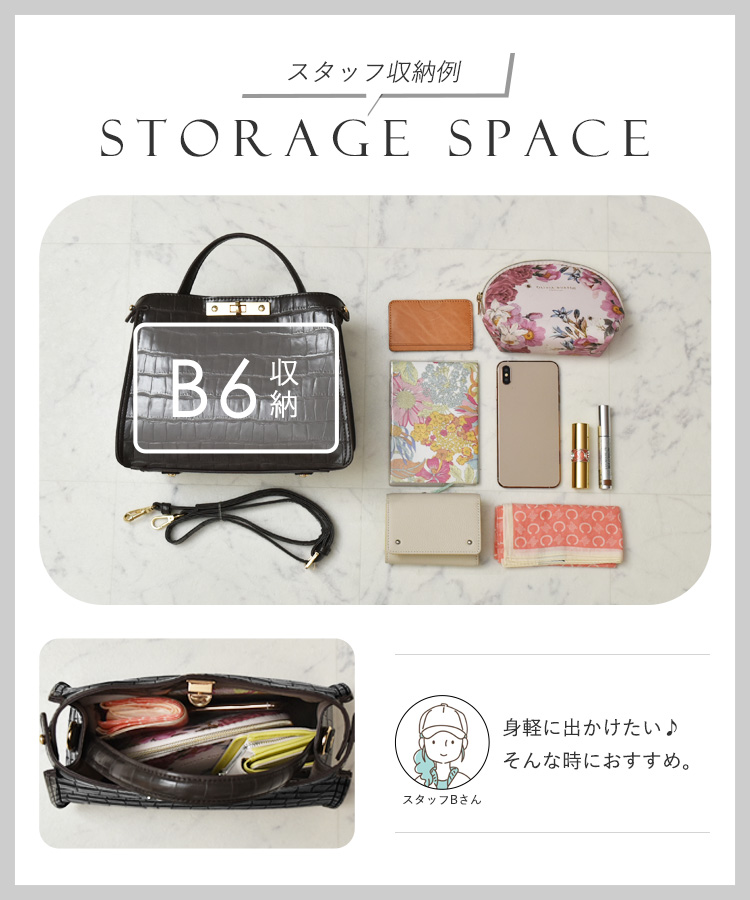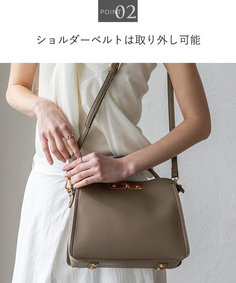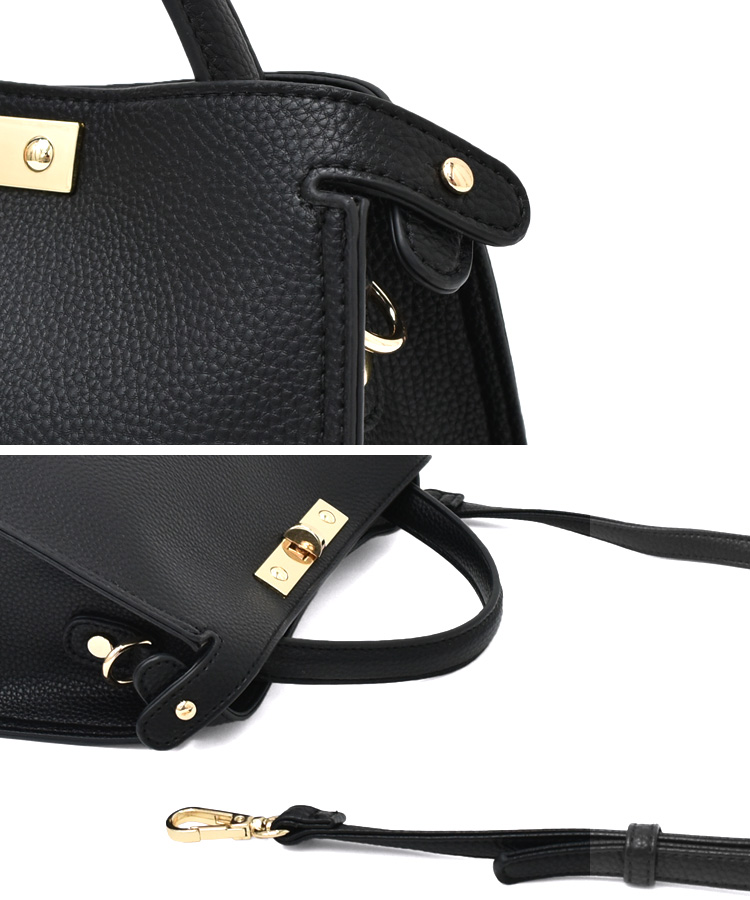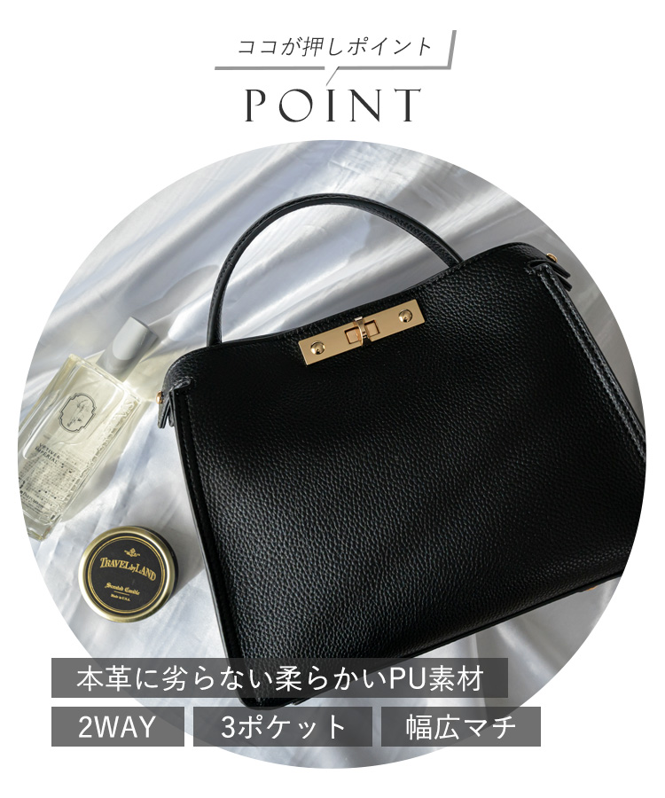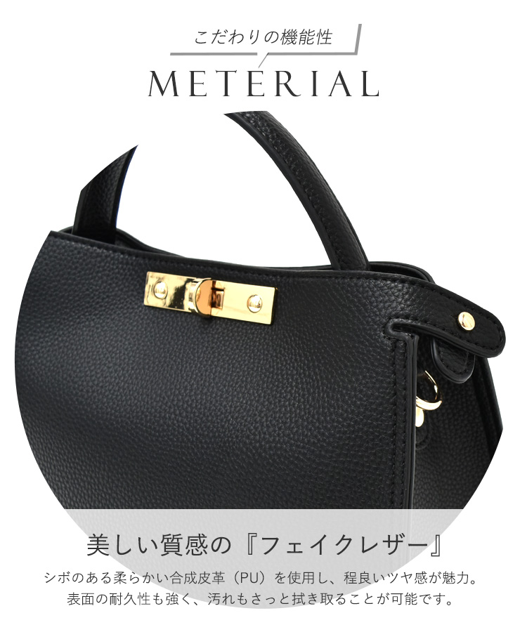 | サイズ | ●SIZE:高さ:約20cm / 幅:約23cm (上辺)約27cm(下辺)/ マチ:約10cm ●ハンドル長さ:約29cm×幅:約2cm、持ち手高さ:約8.5cm ●ショルダーベルト長さ:約89~103cm×幅:約1.5cm(取り外し可能/調節可) ●外ポケット:なし ●内ポケット:オープンポケット2、ファスナー付きポケット1 ●ショルダーベルト重量:約60g ●バッグのみ重量:約290g ●素材:PU ●仕様:2way ●バッグのメイン開閉口は回転金具になっております。 |