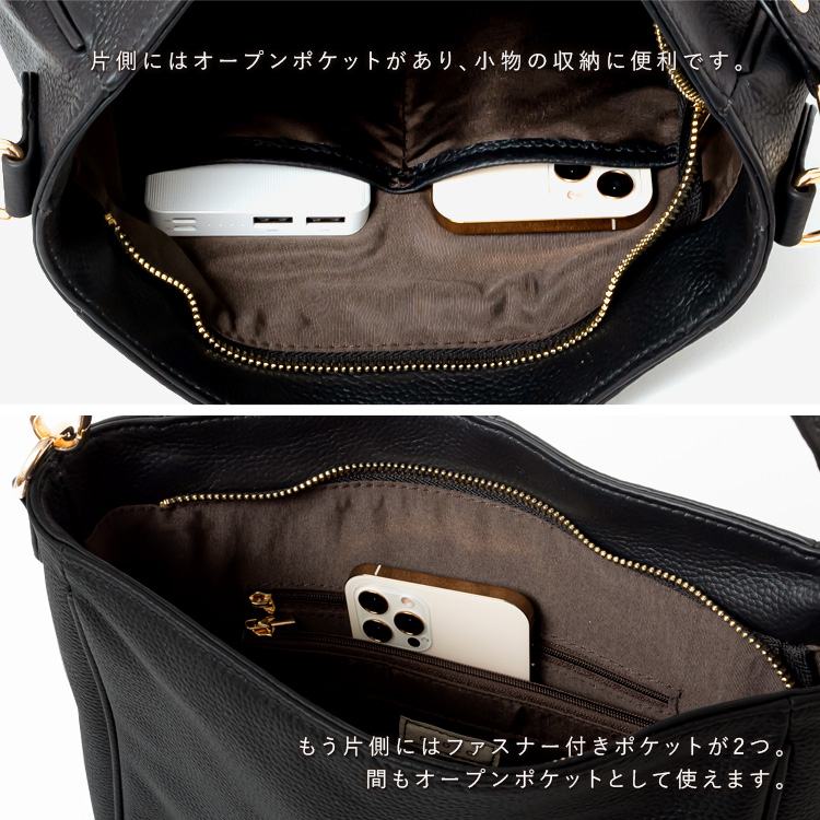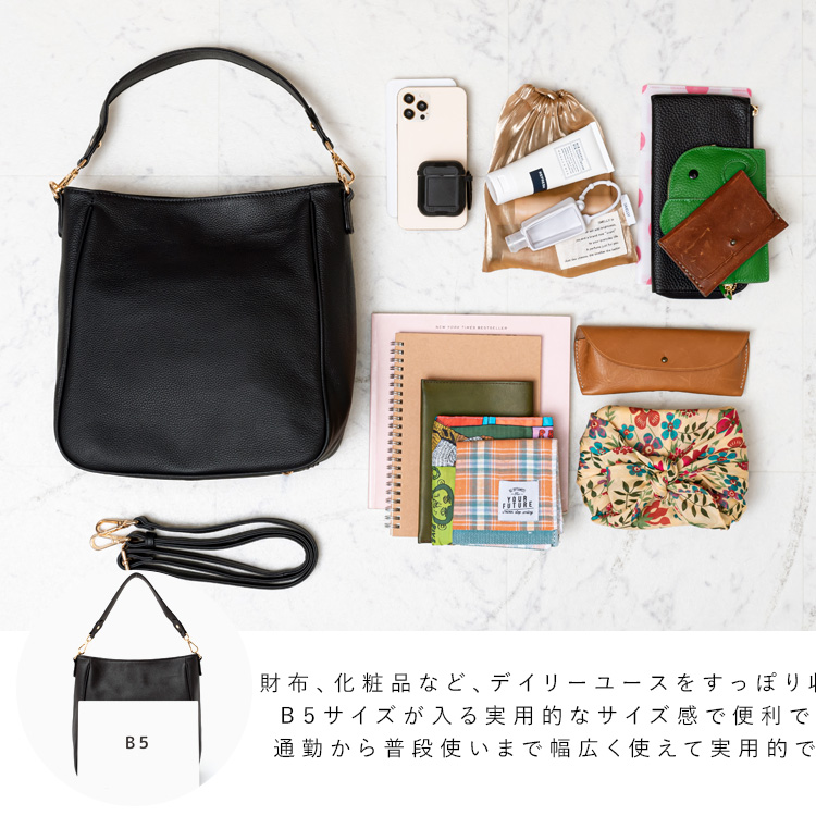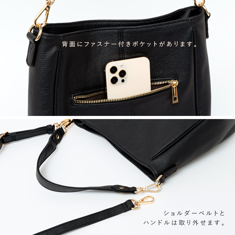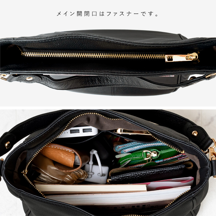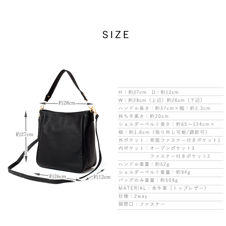 | サイズ | ●SIZE:高さ:約27cm / 幅:約28cm(上辺)約26cm(下辺) / マチ:約12cm ●ハンドル長さ:約37cm×幅:約2.3cm、持ち手高さ:約20cm ●ショルダーベルト長さ:約65~124cm×幅:約1.6cm(取り外し可能/調節可) ●外ポケット:背面ファスナー付きポケット1 ●内ポケット:オープンポケット3、ファスナー付きポケット2 ●ハンドル重量:約52g ●ショルダーベルト重量:約94g ●バッグのみ重量:約509g ●素材:本牛革(トップレザー) ●仕様:2way ●バッグのメイン開閉口はファスナーになっております。 |