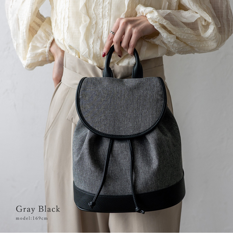 ☆軽くて丈夫なポリエステルとフェイクレザーを使用したミニ巾着リュック。