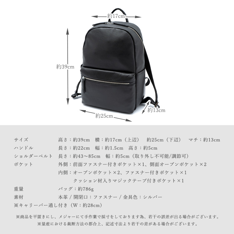 サイズ | ●SIZE:高さ:約39cm / 幅:約17cm(上辺)約25cm(下辺) / マチ:約13cm ●ハンドル長さ:約22cm×幅:約1.5cm、持ち手高さ:約5cm ●ショルダーベルト長さ:約43~85cm×幅:約5cm(取り外し不可能/調節可) ●外ポケット:前面ファスナー付きポケット×1、側面オープンポケット×2 ●内ポケット:オープンポケット2、ファスナー付きポケット1、クッション材入りマジックテープ付きポケット1 ●バッグ重量:約786g ●素材:本革 ●バッグのメイン開閉口はファスナーになっております。 ●金具色:シルバー ※キャリーバー通し付き(W:約28cm) |