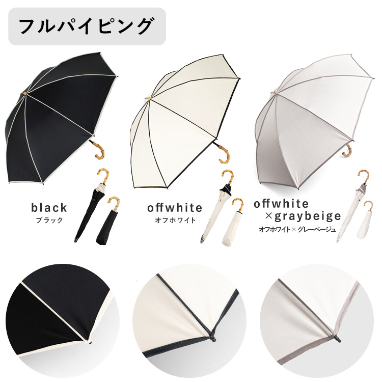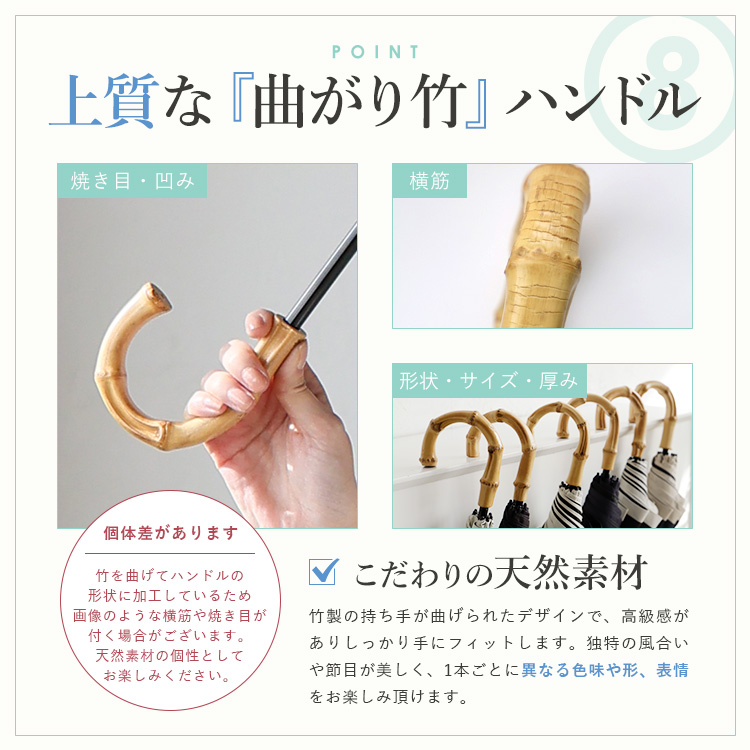| サイズ | ●直径:約90cm ●全長:約62cm ●親骨の長さ:約50cm ●傘骨:8本 ●石突:木(約1.5cm×約0.2cm) ●露先:ABS樹脂 ●手元:竹 ●生地:完全遮光生地(ポリエステル100%裏面PUコーティング) ●親骨:グラスファイバー+アルミ ●中棒:アルミ ●仕様:晴雨兼用傘 ●ネームベルト:ホックボタン ●重さ:刺繍/約225~255g コンビ/約230~260g フルパイピング/約225~255g (竹手元のサイズによって変動) 【長傘時】 ●横:約7cm(最大) ●縦:約62cm ●ボタン:ホックボタン 【収納時】 ●横:約7.5cm ●縦:約38cm ●ボタン:ホックボタン |
