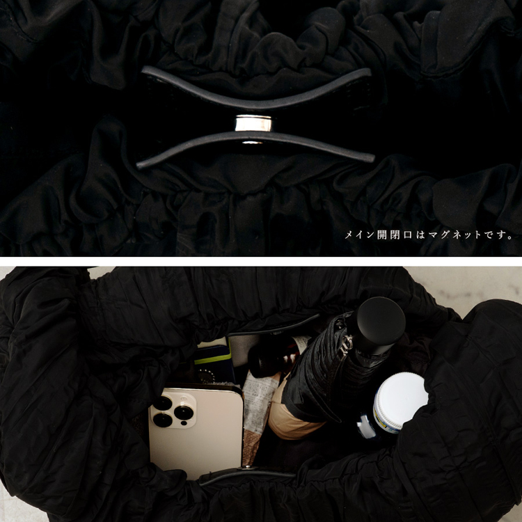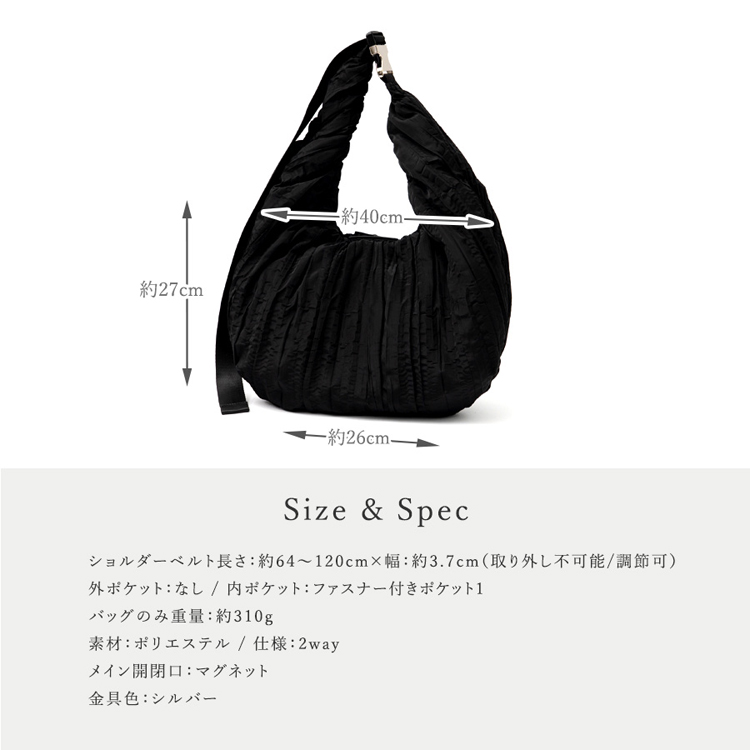 サイズ | ●SIZE:高さ:約27cm / 幅:約40cm(上辺)約26cm(下辺) / マチ:なし ●ショルダーベルト長さ:約64~120cm×幅:約3.7cm(取り外し不可能/調節可) ●ショルダーベルト高さ:約29~60cm ●外ポケット:なし ●内ポケット:ファスナー付きポケット1 ●バッグ重量:約310g ●素材:ポリエステル ●仕様:2way ●バッグのメイン開閉口はマグネットになっております。 ●金具色:シルバー |