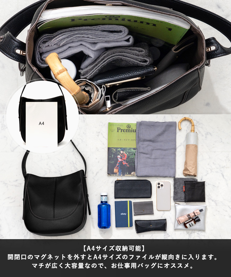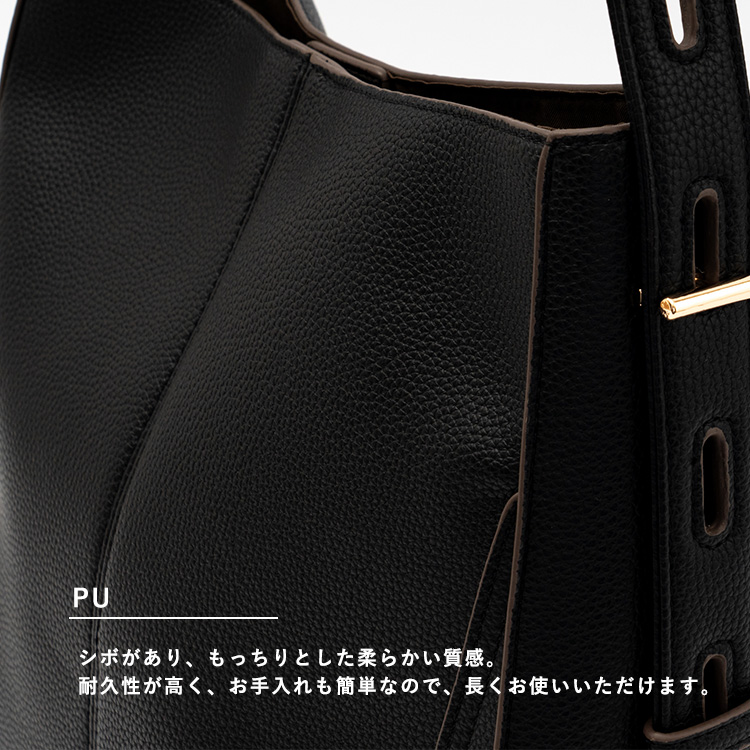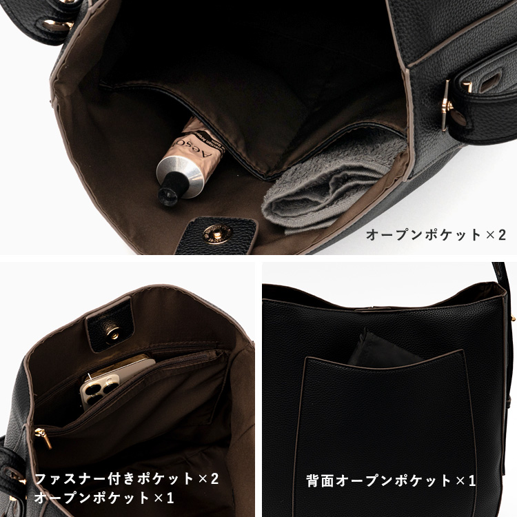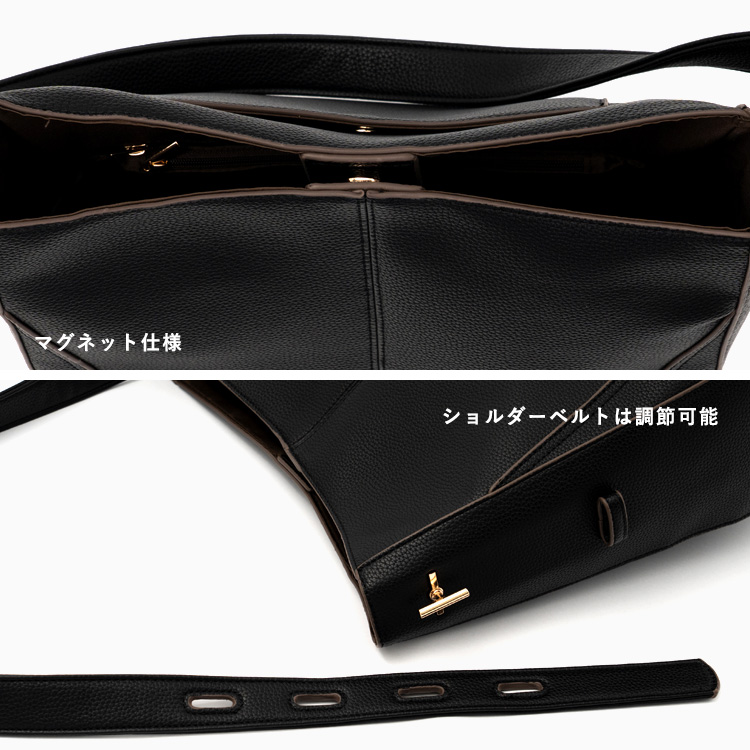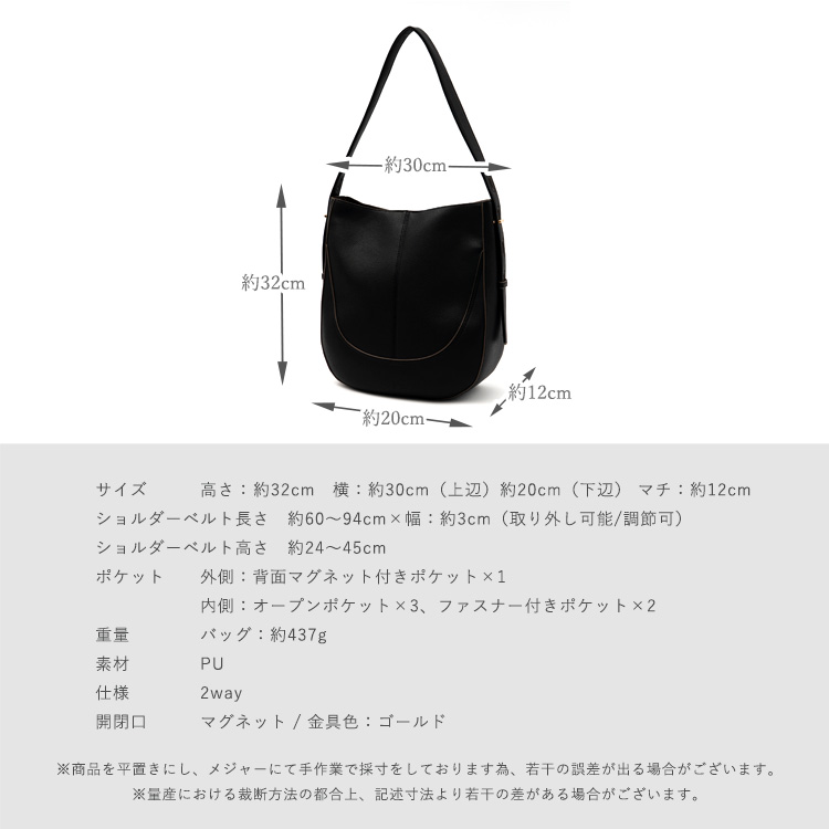 サイズ | ●SIZE:高さ:約32cm / 幅:約30cm(上辺)約20cm(下辺) / マチ:約12cm ●ショルダーベルト長さ:約60~94cm×幅:約3cm(取り外し可能/調節可) ●ショルダーベルト高さ:約24~45cm ●外ポケット:背面マグネット付きポケット1 ●内ポケット:オープンポケット3、ファスナー付きポケット2 ●バッグのみ重量:約437g ●素材:PU ●仕様:2way ●バッグのメイン開閉口はマグネットになっております。 ●金具色:ゴールド |