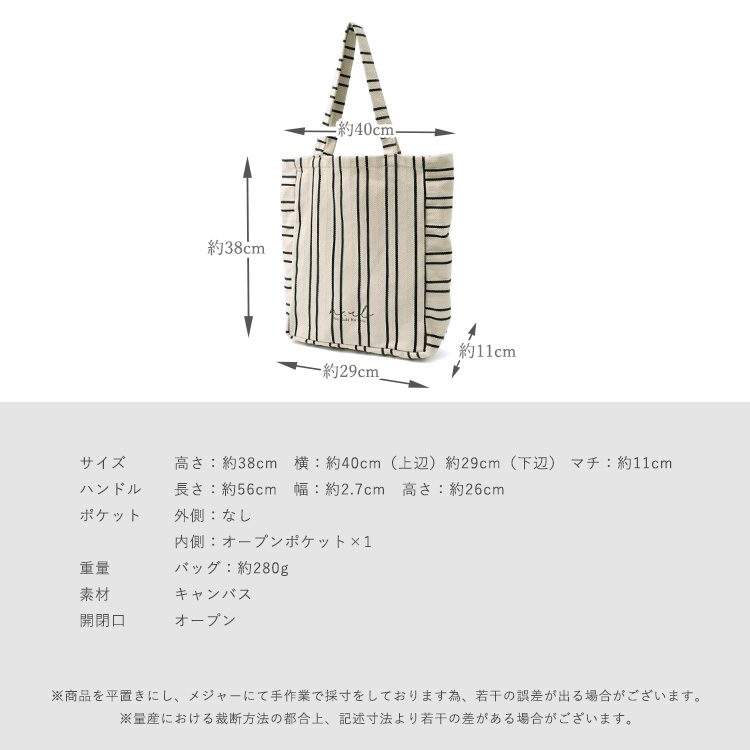 サイズ | ●SIZE:高さ:約38cm / 幅:約40cm(上辺)約29cm(下辺) / マチ:約11cm ●ハンドル長さ:約56cm×幅:約2.7cm、持ち手高さ:約26cm ●外ポケット:なし ●内ポケット:オープンポケット1 ●バッグのみ重量:約280g ●素材:キャンバス ●バッグのメイン開閉口はオープンになっております。 |