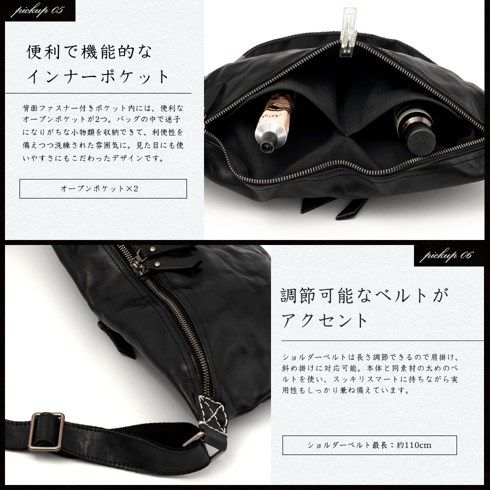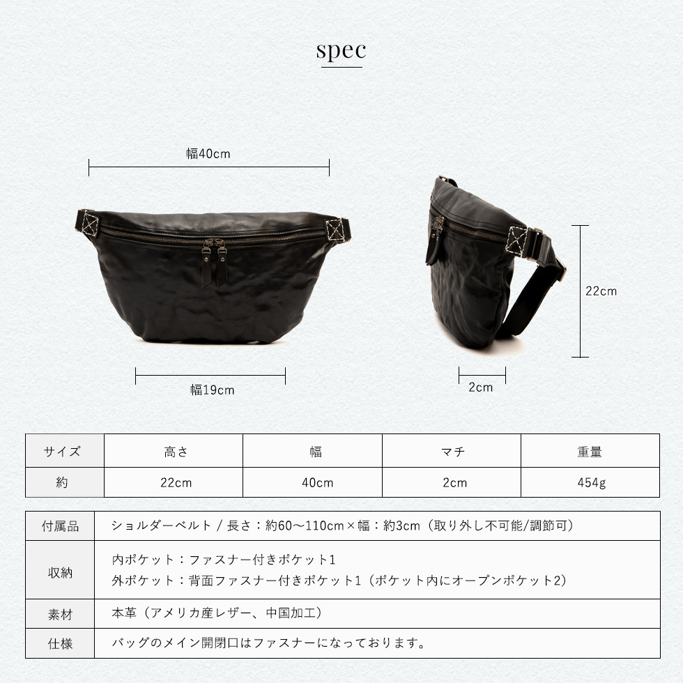 サイズ | ●SIZE:高さ:約22cm / 幅:約40cm(上辺)約19cm(下辺) / マチ:約2cm ●ショルダーベルト長さ:約60~110cm×幅:約3cm(取り外し不可能/調節可) ●ショルダーベルト高さ:約25~53cm ●外ポケット:背面ファスナー付きポケット1(ポケット内にオープンポケット2) ●内ポケット:ファスナー付きポケット1 ●バッグのみ重量:約454g ●素材:本革(アメリカ産レザー、中国加工) ●バッグのメイン開閉口はファスナーになっております。 ●金具色:アンティークシルバー |