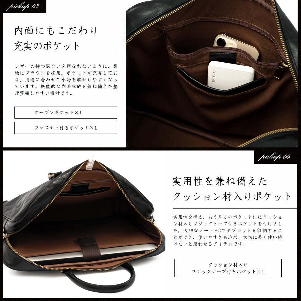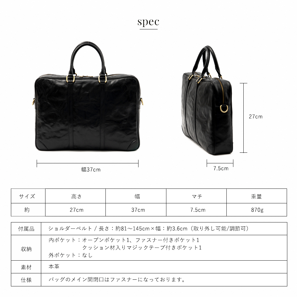 サイズ | ●SIZE:高さ:約27cm / 幅:約37cm / マチ:約7.5cm ●ハンドル長さ:約31cm×幅:約1.5cm、持ち手高さ:約12cm ●ショルダーベルト長さ:約81~145cm×幅:約3.6cm(取り外し可能/調節可) ●外ポケット:なし ●内ポケット:オープンポケット1、ファスナー付きポケット1、クッション材入りマジックテープ付きポケット1 ●ショルダーベルト重量:約133g ●バッグのみ重量:約870g ●素材:本革(イタリア産レザー、中国加工) ●仕様:2way ●バッグのメイン開閉口はファスナーになっております。 ●金具色:アンティークゴールド |