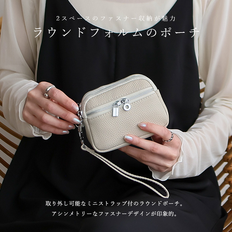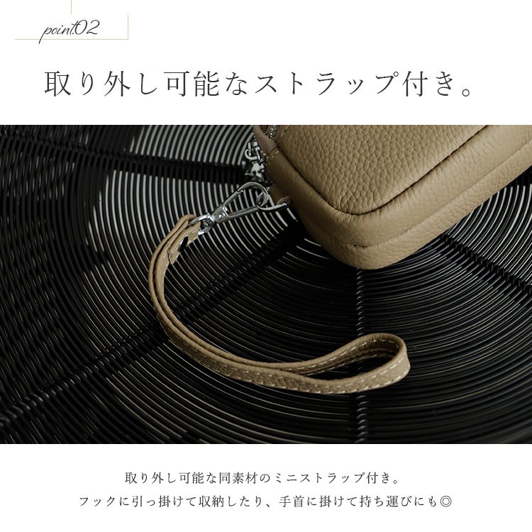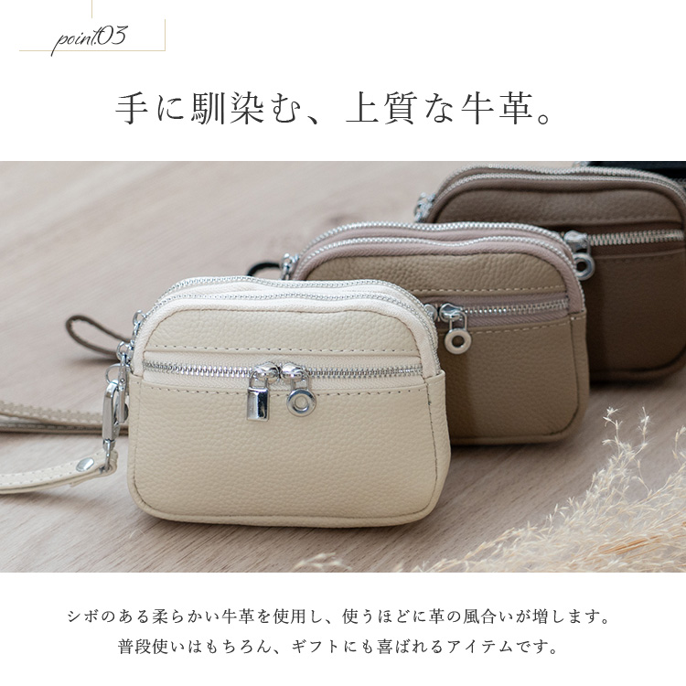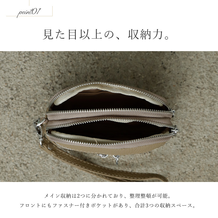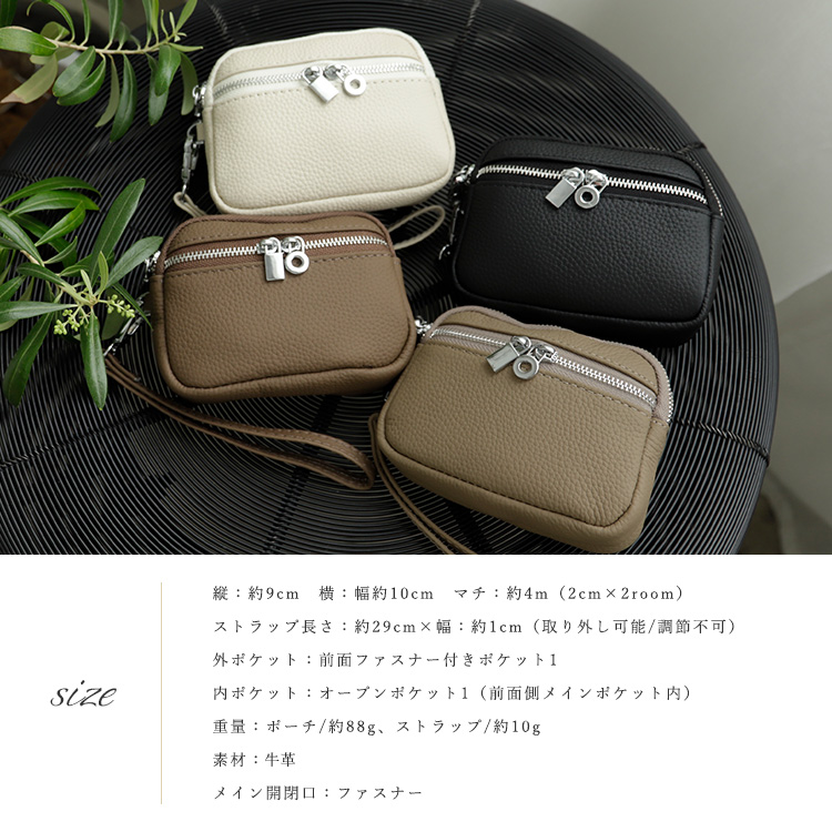 サイズ | ●SIZE:高さ:約9cm / 幅:約10cm(上辺)約12cm(下辺) / マチ:約4cm(2cm×2room) ●ストラップ長さ:約29cm×幅:約1cm(取り外し可能/調節不可) ●ストラップ高さ:約14cm ●外ポケット:前面ファスナー付きポケット1 ●内ポケット:オープンポケット1(前面側メインポケット内) ●ストラップ重量:約10g ●バッグのみ重量:約88g ●素材:牛革 ●バッグのメイン開閉口はファスナーになっております。 ※ストラップ付き(取り外し可能) |