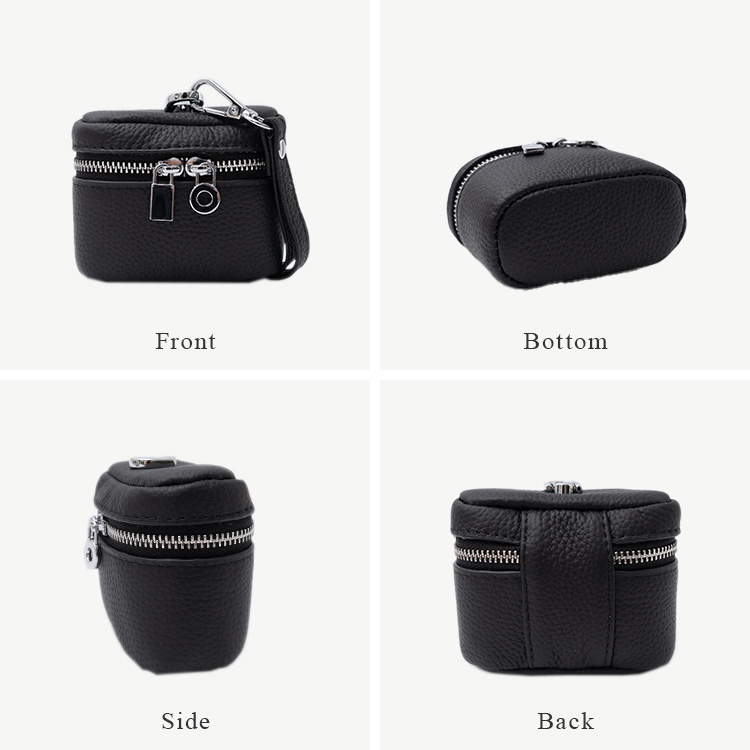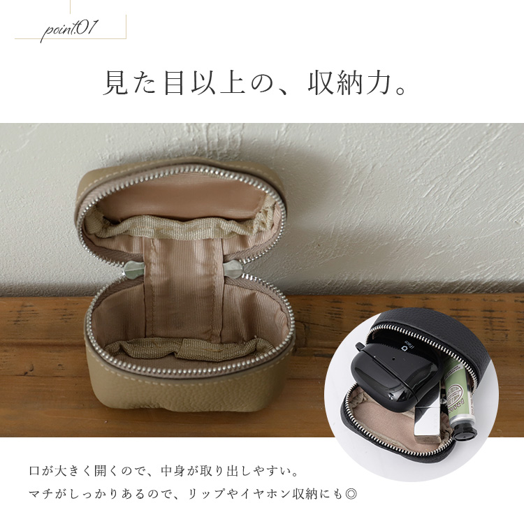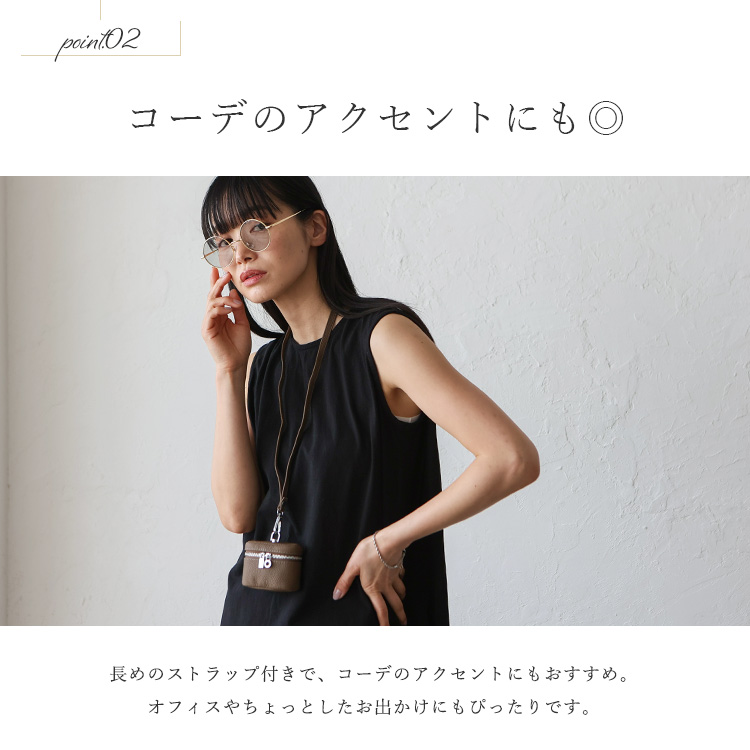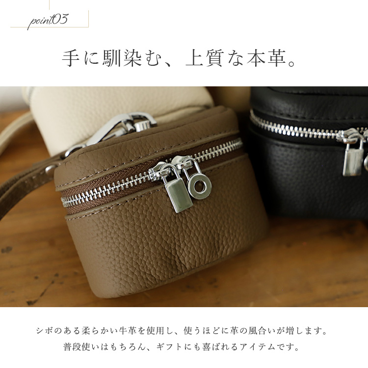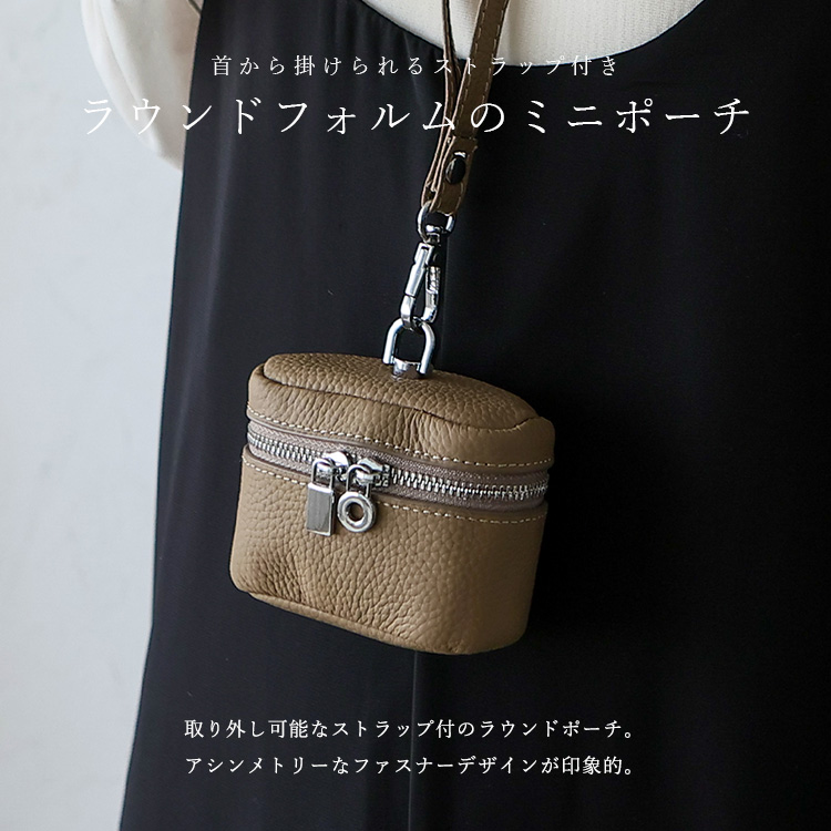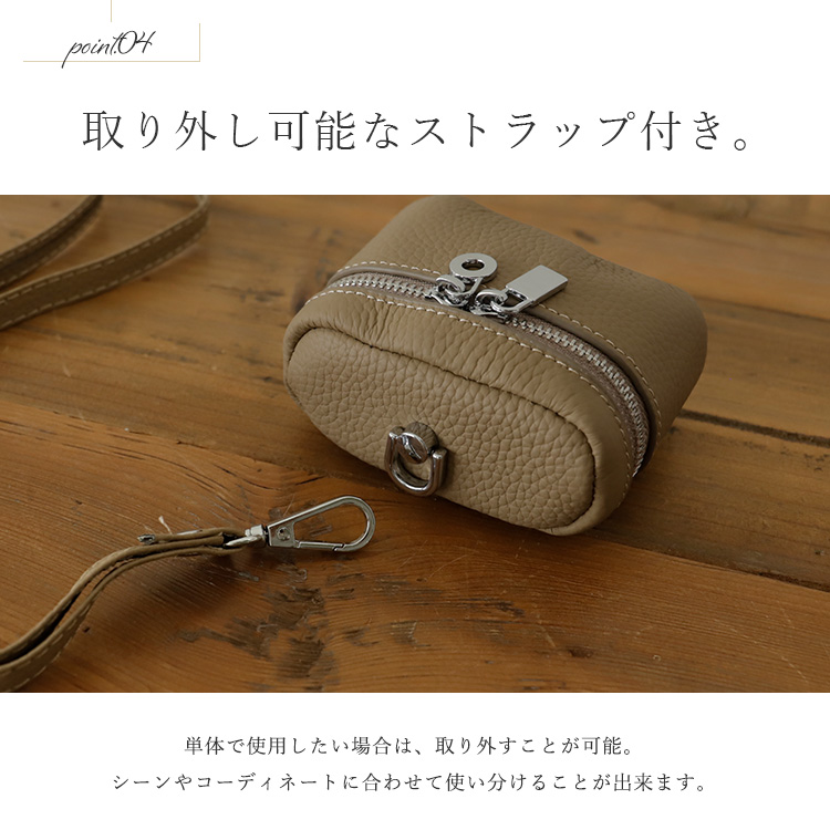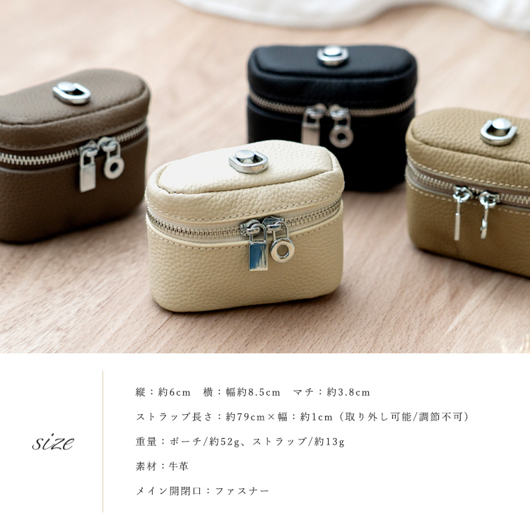 サイズ | ●SIZE:高さ:約6cm / 幅:約8.5cm / マチ:約3.8cm ●ストラップ長さ:約79cm×幅:約1cm(取り外し可能/調節不可) ●ストラップ高さ:約38cm ●外ポケット:なし ●内ポケット:なし ●ストラップ重量:約13g ●ポーチのみ重量:約52g ●素材:牛革 ●ポーチのメイン開閉口はファスナーになっております。 |