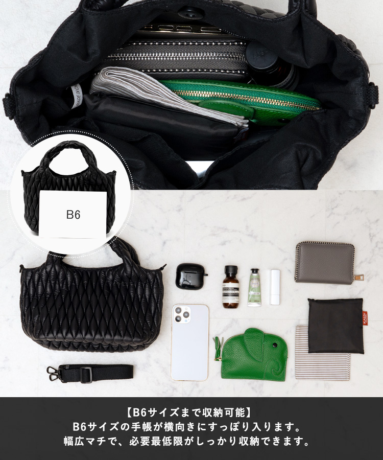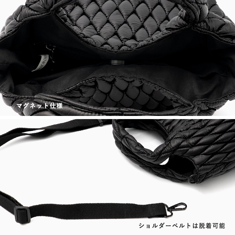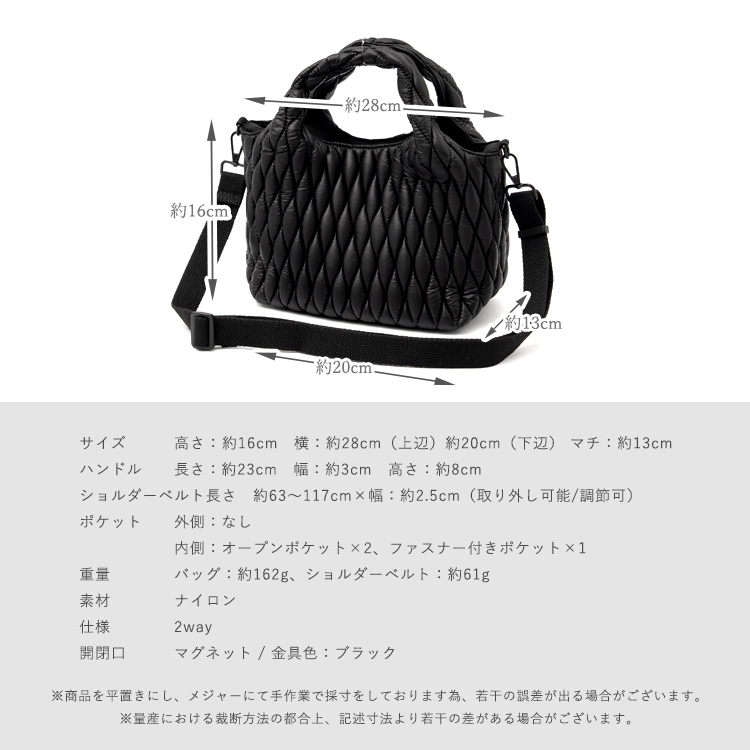 サイズ | ●SIZE:高さ:約16cm / 幅:約28cm(上辺)約20cm(下辺) / マチ:約13cm ●ハンドル長さ:約23cm×幅:約3cm、持ち手高さ:約8cm ●ショルダーベルト長さ:約63~117cm×幅:約2.5cm(取り外し可能/調節可)●外ポケット:なし ●内ポケット:オープンポケット2、ファスナー付きポケット1 ●ショルダーベルト重量:約61g ●バッグのみ重量:約162g ●素材:ナイロン ●仕様:2way ●バッグのメイン開閉口はマグネットになっております。 ●金具色:ブラック |