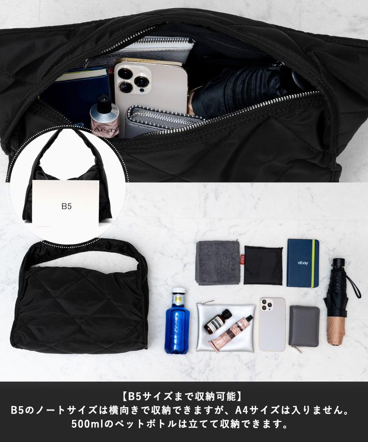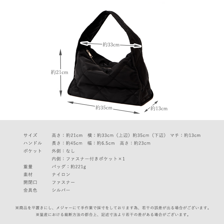 | サイズ | ●SIZE:高さ:約21cm / 幅:約33cm(上辺)約35cm(下辺) / マチ:約13cm ●ハンドル長さ:約45cm×幅:約6.5cm、持ち手高さ:約23cm ●外ポケット:なし ●内ポケット:ファスナー付きポケット1 ●バッグのみ重量:約221g ●素材:ナイロン ●バッグのメイン開閉口はファスナーになっております。 ●金具色:シルバー |