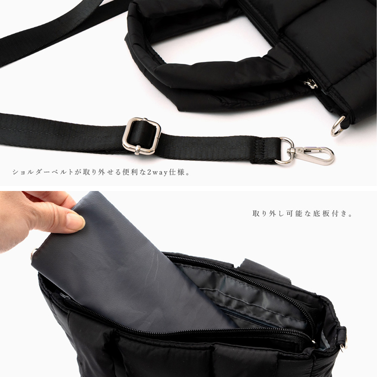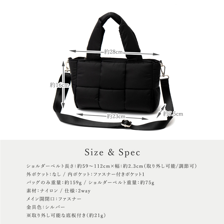 | サイズ | ●SIZE:高さ:約16cm / 幅:約28cm(上辺)約23cm(下辺) / マチ:約7.5cm ●ハンドル長さ:約35cm×幅:約2.3cm、持ち手高さ:約16cm ●ショルダーベルト長さ:約59~112cm×幅:約2.3cm(取り外し可能/調節可) ●外ポケット:なし ●内ポケット:ファスナー付きポケット1 ●ショルダーベルト重量:約75g ●バッグのみ重量:約159g ●素材:ナイロン ●仕様:2way ●バッグのメイン開閉口はファスナーになっております。 ●金具色:シルバー ※取り外し可能な底板付き(約21g) |