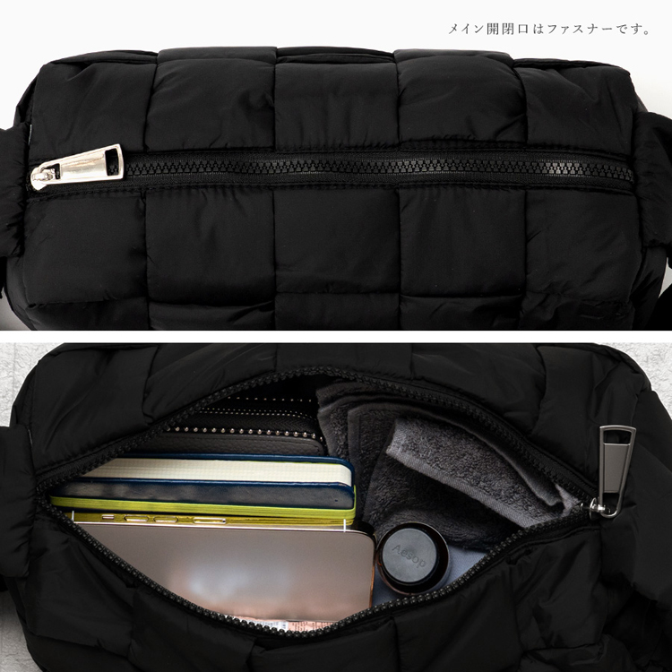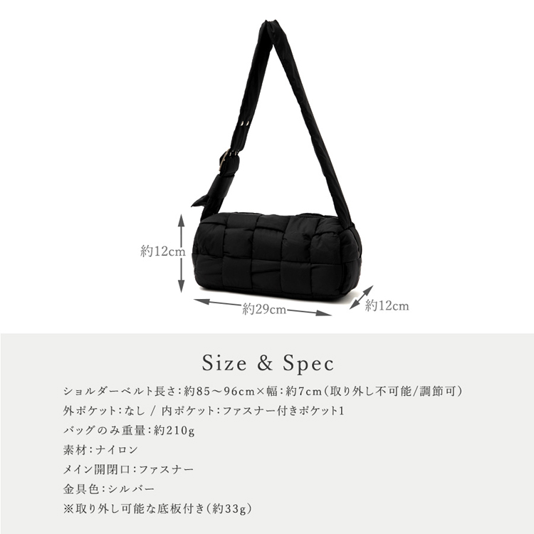 | サイズ | ●SIZE:高さ:約12cm / 幅:約29cm / マチ:約12cm ●ショルダーベルト長さ:約85~96cm×幅:約7cm(取り外し不可能/調節可) ●ショルダーベルト高さ:約38~43cm ●外ポケット:なし ●内ポケット:ファスナー付きポケット1 ●バッグ重量:約210g ●素材:ナイロン ●バッグのメイン開閉口はファスナーになっております。 ●金具色:シルバー ※取り外し可能な底板付き(約33g) |