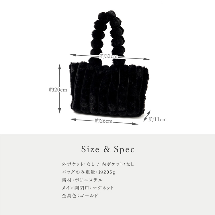 サイズ | ●SIZE:高さ:約20cm / 幅:約32cm(上辺)約26cm(下辺) / マチ:約11cm ●ハンドル長さ:約41cm×幅:約3cm、持ち手高さ:約17cm ●外ポケット:なし ●内ポケット:なし ●バッグのみ重量:約205g ●素材:ポリエステル ●バッグのメイン開閉口はマグネットになっております。 ●金具色:ゴールド |