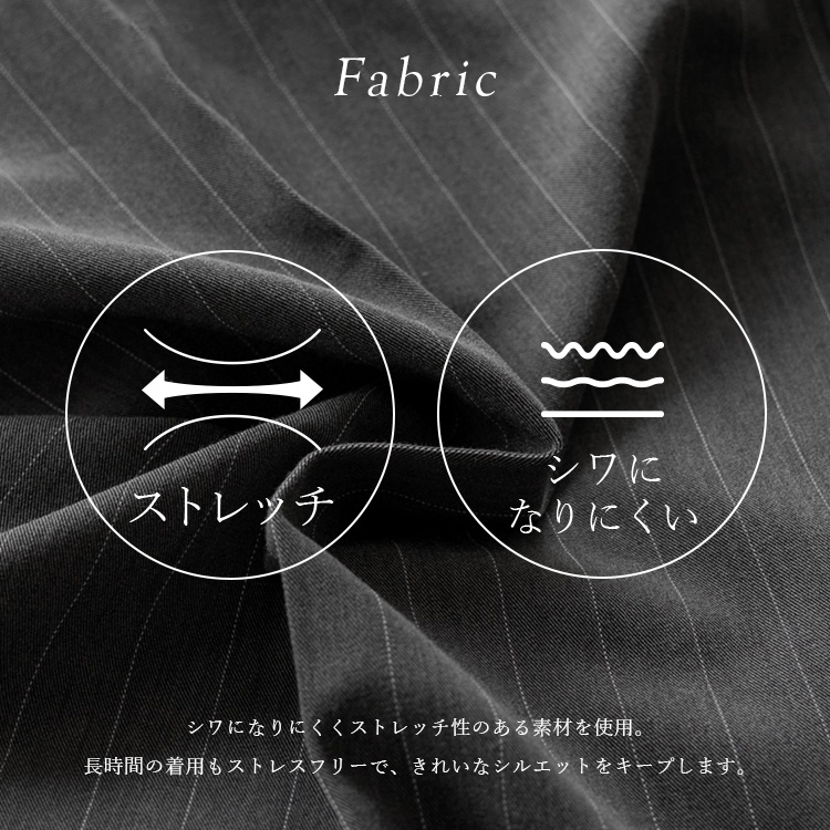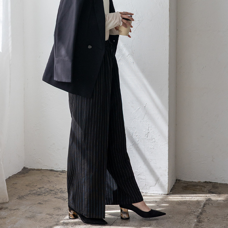 ほどよい落ち感と、ピンストライプの縦ラインがスタイルアップを叶えてくれる、