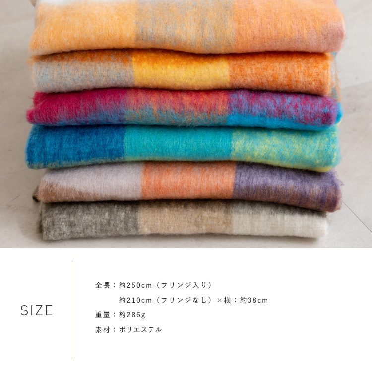 | サイズ | ●全長:約250cm(フリンジ入り)210cm(フリンジなし) × 横38cm ●重さ:約286g ●素材:ポリエステル |