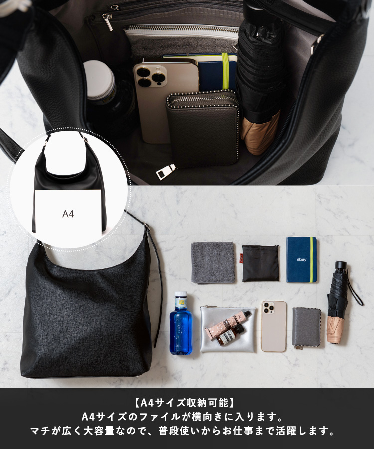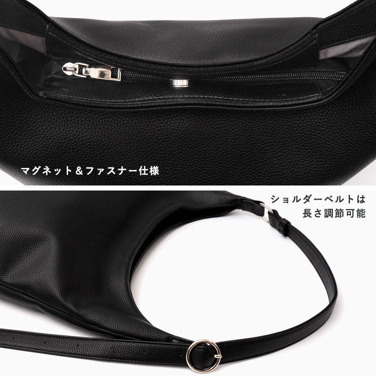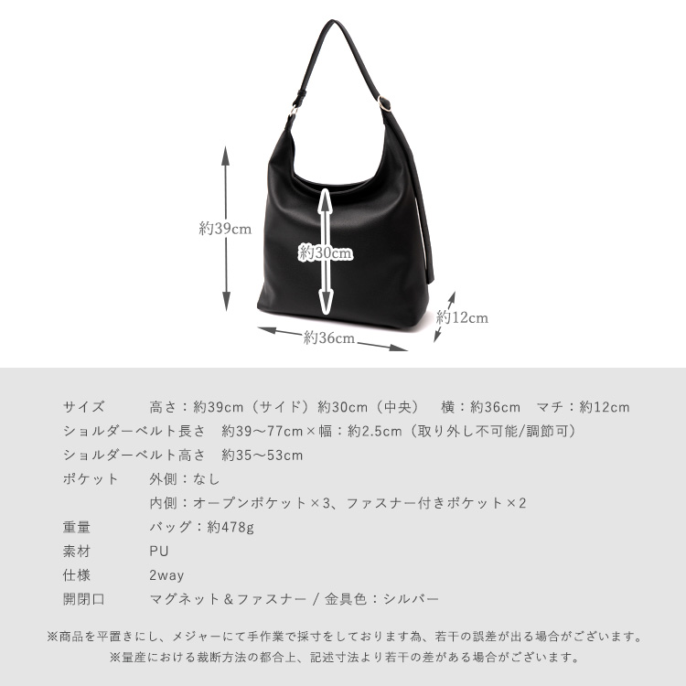 | サイズ | ●SIZE:高さ:約39cm(サイド)約30cm(中央) / 幅:約36cm / マチ:約12cm ●ショルダーベルト長さ:約39~77cm×幅:約2.5cm(取り外し不可能/調節可) ●ショルダーベルト高さ:約35~53cm ●外ポケット:なし ●内ポケット:オープンポケット3、ファスナー付きポケット2 ●バッグのみ重量:約478g ●素材:PU ●仕様:2way ●バッグのメイン開閉口はマグネット&ファスナーになっております。 ●金具色:シルバー |