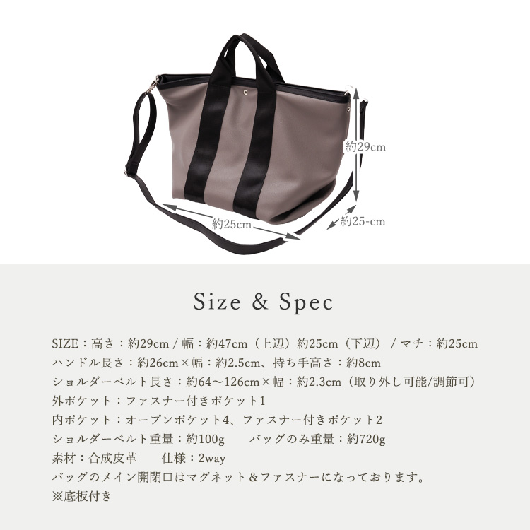 | サイズ | ●SIZE:高さ:約29cm / 幅:約47cm(上辺)約25cm(下辺)/ マチ:約25cm ●ハンドル長さ:約26cm×幅:約2.5cm、持ち手高さ:約8cm ●ショルダーベルト長さ:約64~126cm×幅:約2.3cm(取り外し可能/調節可) ●外ポケット:ファスナー付きポケット1 ●内ポケット:オープンポケット4、ファスナー付きポケット2 ●バッグのみ重量:約720g ●ショルダー重量:約100g ●素材:合成皮革 ●仕様:2way ●バッグのメイン開閉口はマグネット&ファスナーになっております。 |