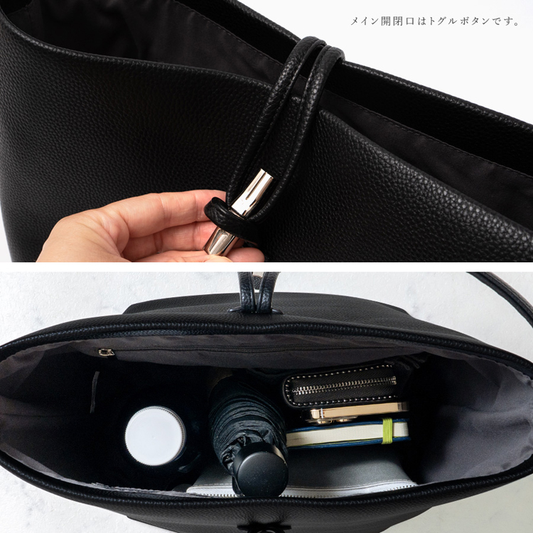 | サイズ | ●SIZE:高さ:約31cm / 幅:約38cm(上辺)約22cm(下辺)/ マチ:約17cm ●ハンドル長さ:約52cm×幅:約2.6cm、持ち手高さ:約20cm ●ショルダーベルト長さ:約74~114cm×幅:約3.8cm(取り外し可能/調節可) ●外ポケット:なし ●内ポケット:オープンポケット2、ファスナー付きポケット1 ●ショルダーベルト重量:約128g ●バッグのみ重量:約408g ●素材:PU ●仕様:2way ●バッグのメイン開閉口はトグルボタンになっております。 ●金具色:シルバー |