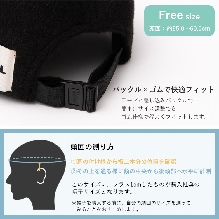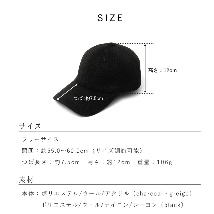| サイズ | ●SIZE:フリー ●頭囲:約55cm(最小)約60cm(最大) ●つばの長さ:約7.5cm ●帽子の深さ:約12cm ●素材:ポリエステル/ウール/アクリル ポリエステル/ウール/ナイロン/レーヨン(BK) ●重量:106g |