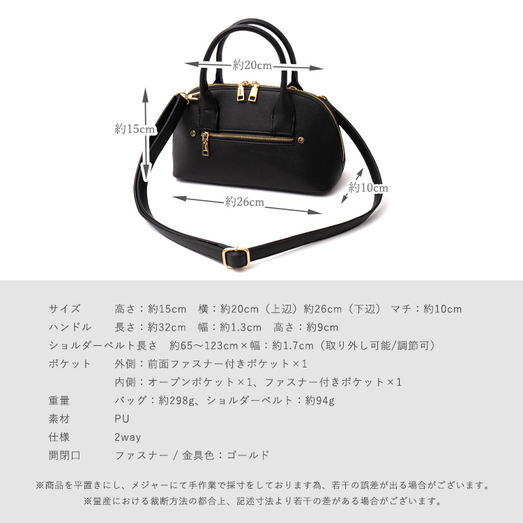 | サイズ | ●SIZE:高さ:約15cm / 幅:約20cm(上辺)約26cm(下辺) / マチ:約10cm ●ハンドル長さ:約32cm×幅:約1.3cm、持ち手高さ:約9cm ●ショルダーベルト長さ:約65~123cm×幅:約1.7cm(取り外し可能/調節可) ●外ポケット:前面ファスナー付きポケット1 ●内ポケット:オープンポケット1、ファスナー付きポケット1 ●ショルダーベルト重量:約94g ●バッグのみ重量:約298g ●素材:PU ●仕様:2way ●バッグのメイン開閉口はファスナーになっております。 ●金具色:ゴールド |
