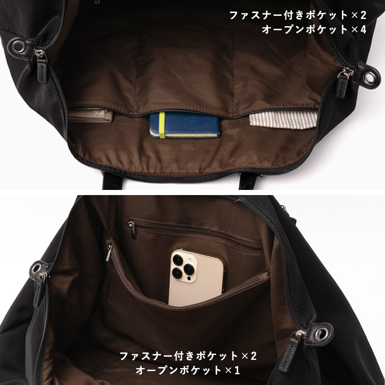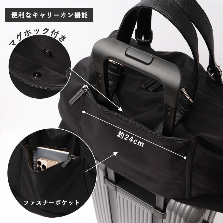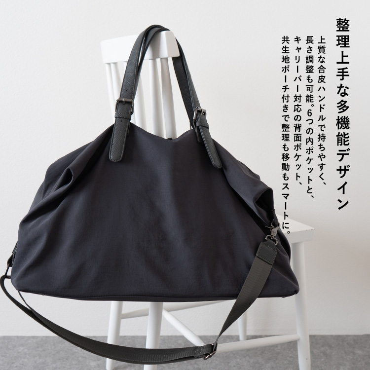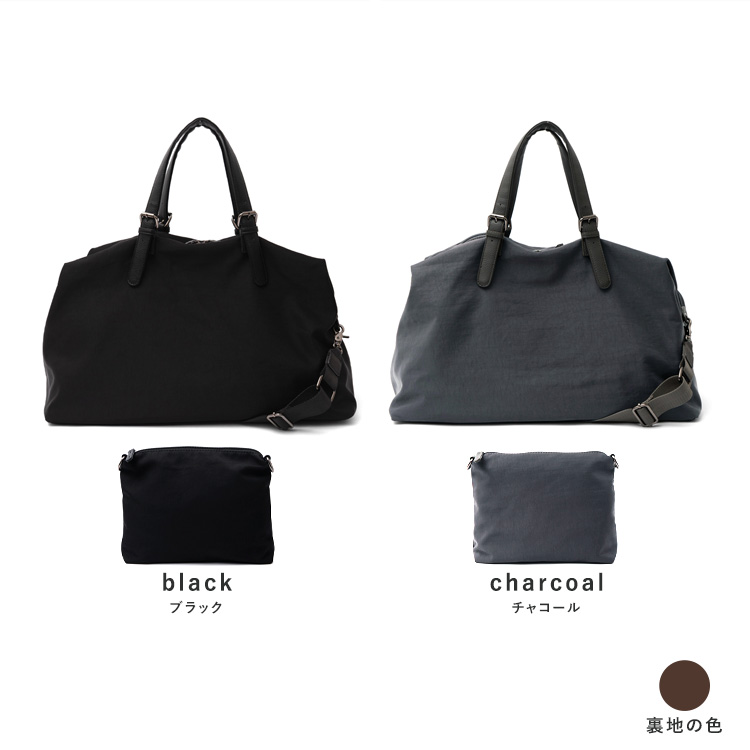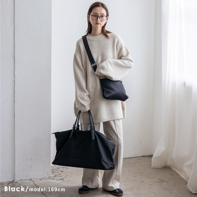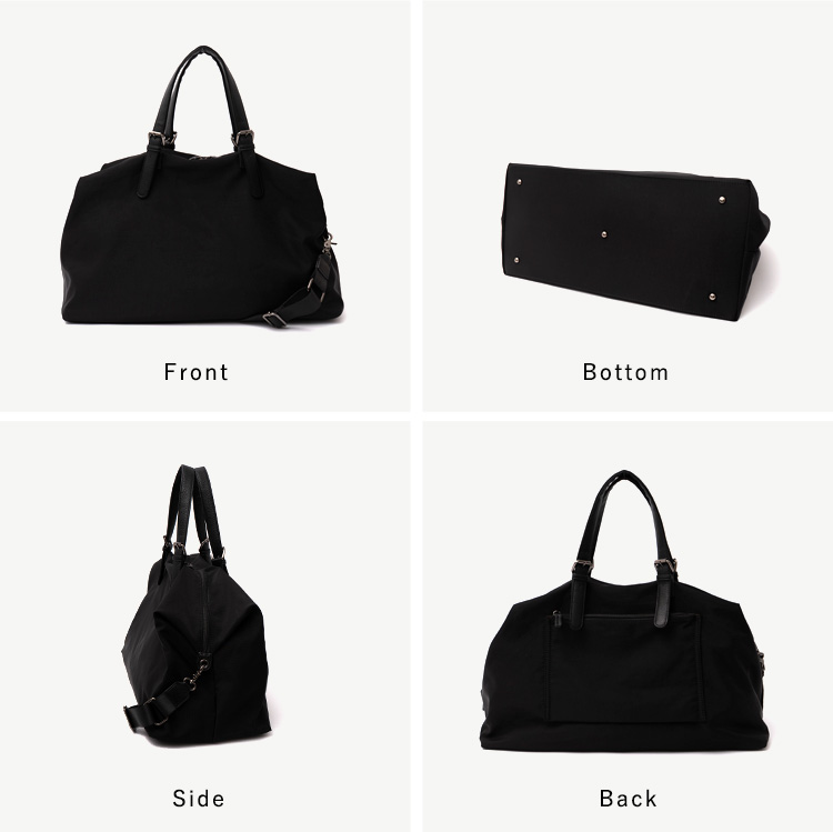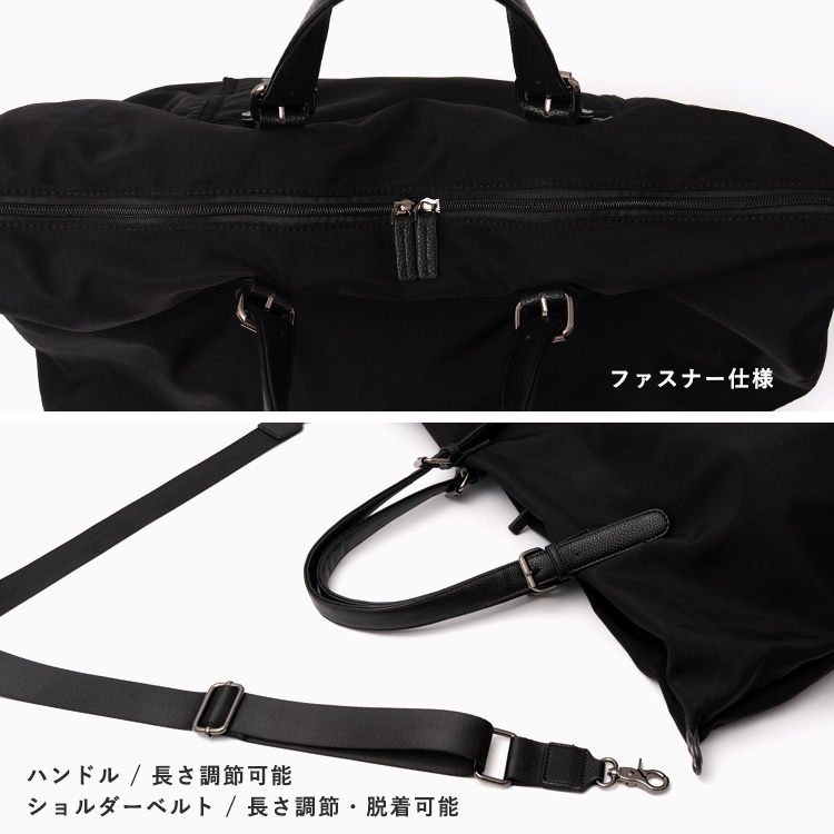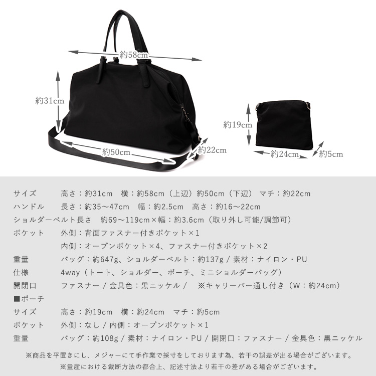 | サイズ | ●SIZE:高さ:約31cm / 幅:約58cm(上辺)約50cm(下辺) / マチ:約22cm ●ハンドル長さ:約35~47cm×幅:約2.5cm、持ち手高さ:約16~22cm ●ショルダーベルト長さ:約69~119cm×幅:約3.6cm(取り外し可能/調節可) ●外ポケット:背面ファスナー付きポケット1 ●内ポケット:オープンポケット4、ファスナー付きポケット2 ●ショルダーベルト重量:約137g ●バッグのみ重量:約647g ●素材:ナイロン・PU ●仕様:4way(トート、ショルダー、ポーチ、ミニショルダーバッグ) ●バッグのメイン開閉口はファスナーになっております。 ●金具色:黒ニッケル ※キャリーバー通し付き(W:約24cm) ■ポーチ ●SIZE:高さ:約19cm / 約24cm / マチ:約5cm ●外ポケット:なし ●内ポケット:オープンポケット1 ●重さ:約108g ●素材:ナイロン・PU ●バッグのメイン開閉口はファスナーになっております。 ●金具色:黒ニッケル |