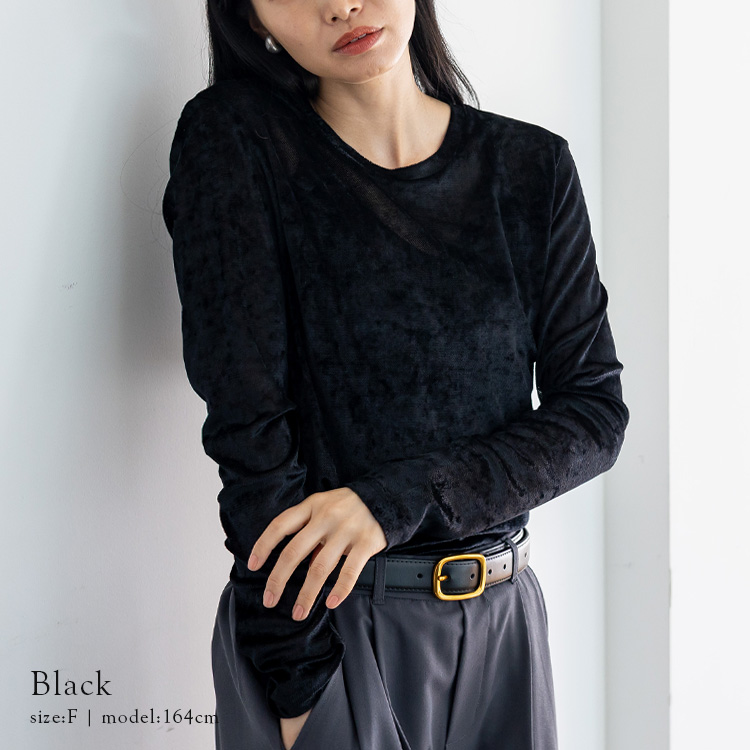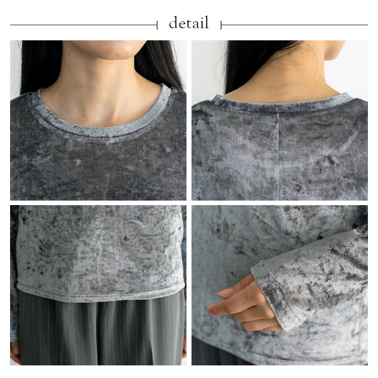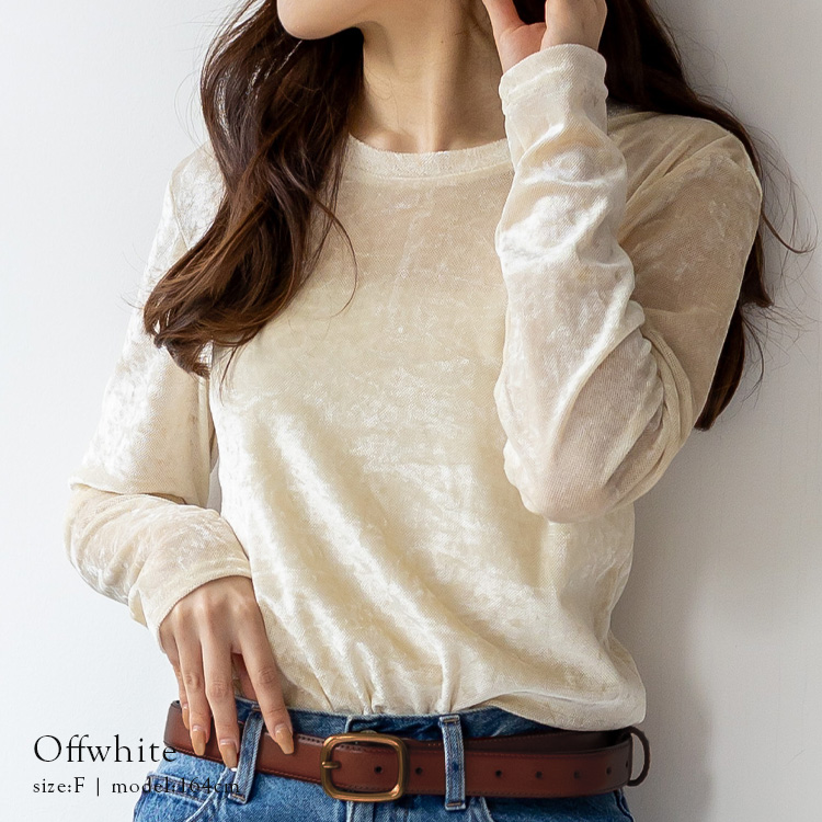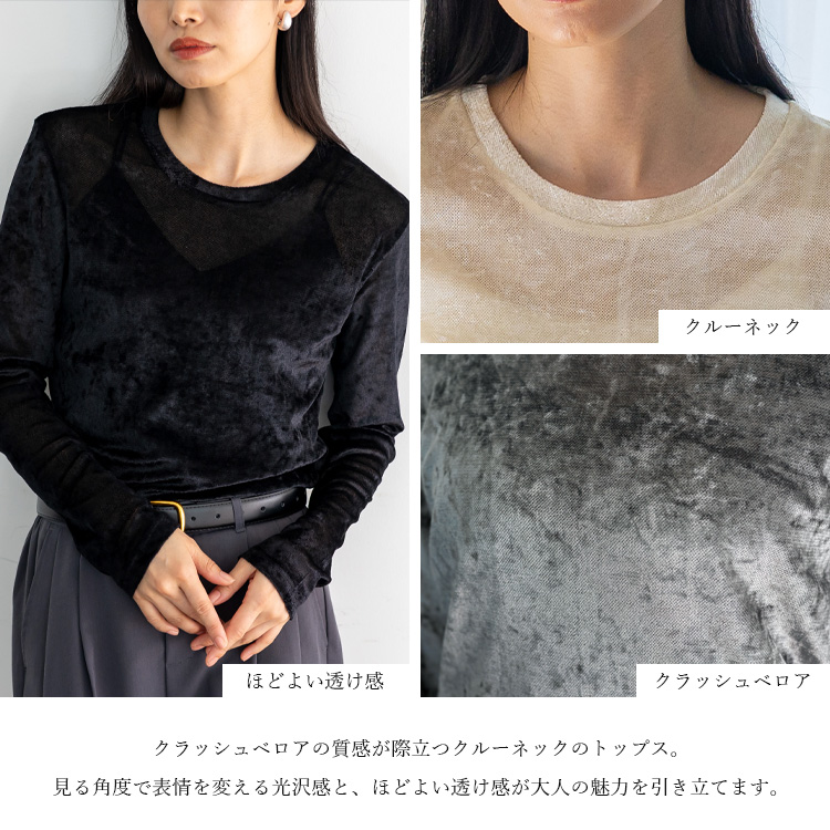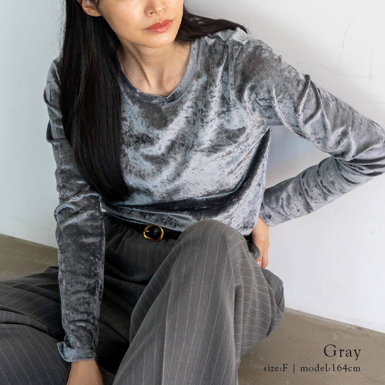 今季大注目なクラッシュベロア素材を使用した、クルーネックトップス。