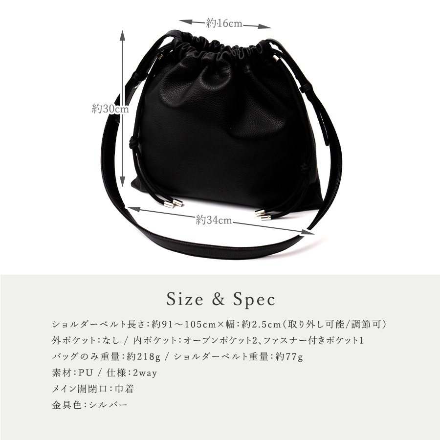 | サイズ | ●SIZE:高さ:約30cm / 幅:約31cm(開いた時)約16cm(閉じた時)(上辺)約34cm(下辺) / マチ:なし ●ショルダーベルト長さ:約91~105cm×幅:約2.5cm(取り外し可能/調節可) ●ショルダーベルト高さ:約40~50cm ●外ポケット:なし ●内ポケット:オープンポケット2、ファスナー付きポケット1 ●ショルダーベルト重量:約77g ●バッグのみ重量:約218g ●素材:PU ●仕様:2way ●バッグのメイン開閉口は巾着になっております。 ●金具色:シルバー |