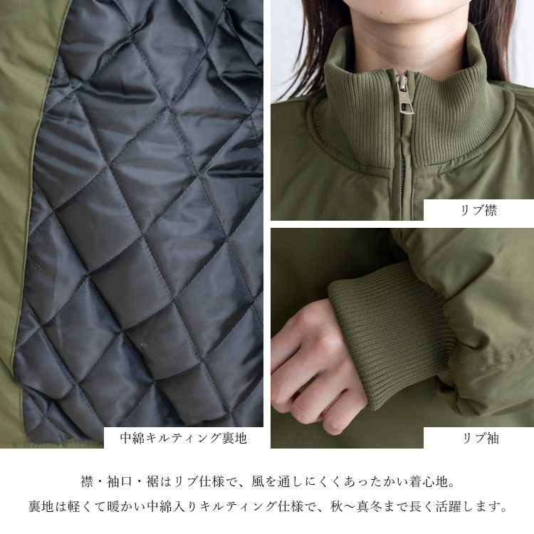 襟・袖口・裾はリブ仕様で、風を通しにくくあったかい着心地。