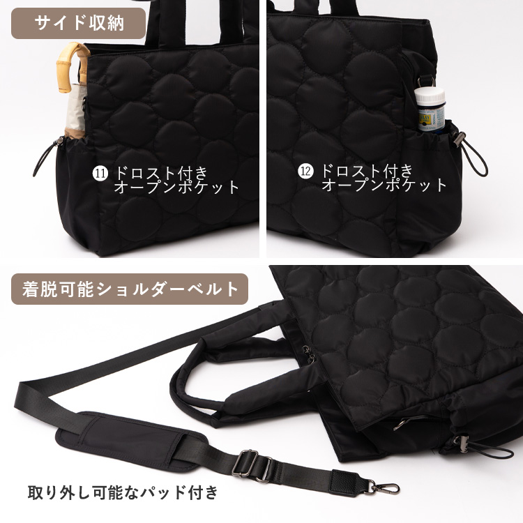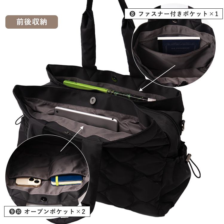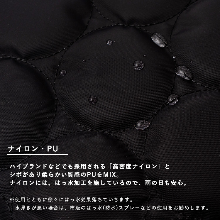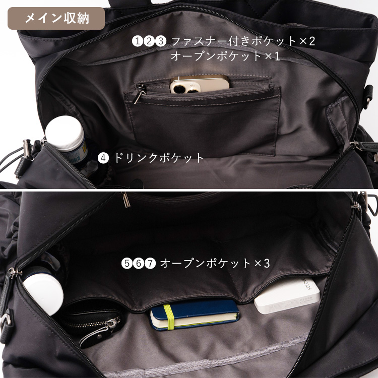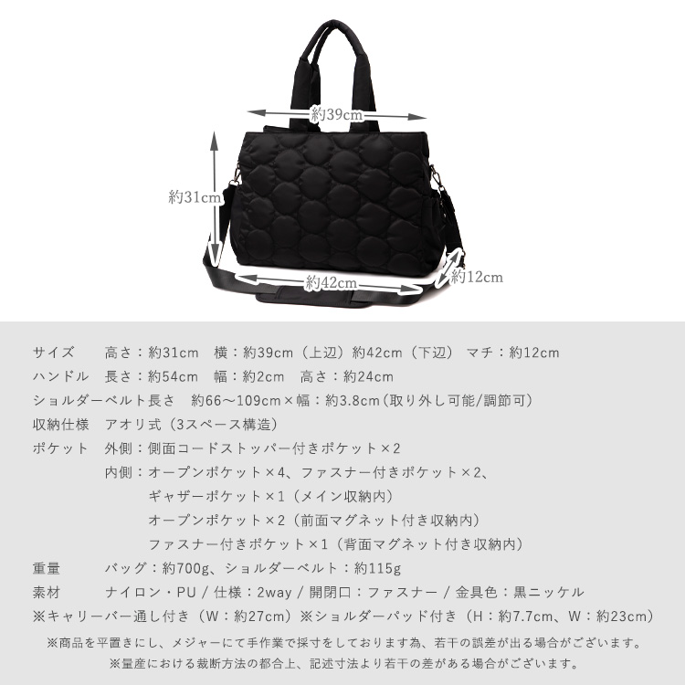 | サイズ | ●SIZE:高さ:約31cm / 幅:約39cm(上辺)約42cm(下辺) / マチ:約12cm ●ハンドル長さ:約54cm×幅:約2cm、持ち手高さ:約24cm ●ショルダーベルト長さ:約66~109cm×幅:約3.8cm(取り外し可能/調節可) ●収納仕様:アオリ式(3スペース構造) ●外ポケット:側面コードストッパー付きポケット2 ●内ポケット:オープンポケット4、ファスナー付きポケット2、ギャザーポケット1(メイン収納内) オープンポケット2(前面マグネット付き収納内) ファスナー付きポケット1(背面マグネット付き収納内) ●ショルダーベルト重量:約115g ●バッグのみ重量:約700g ●素材:ナイロン/PU ●仕様:2way ●バッグのメイン開閉口はファスナーになっております。 ●金具色:黒ニッケル ※キャリーバー通し付き(W:約27cm) ※ショルダーパッド付き(H:約7.7cm、W:約23cm) |