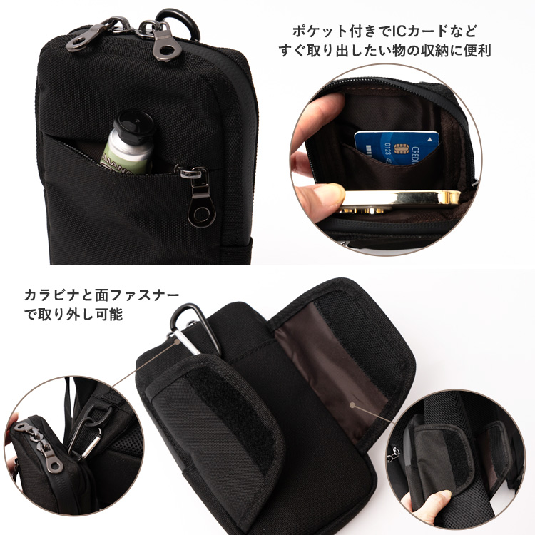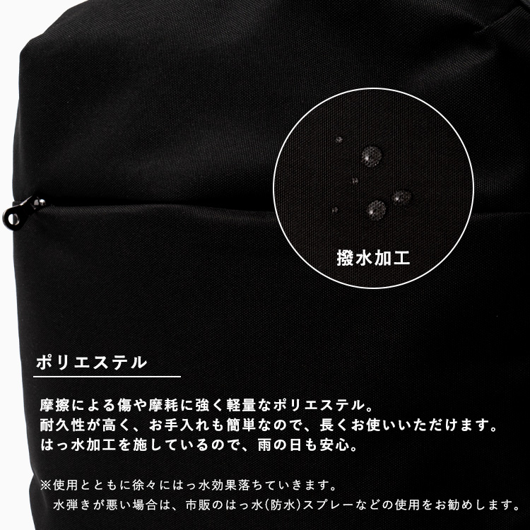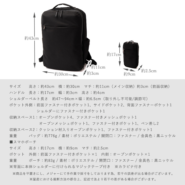 | サイズ | ●SIZE:高さ:約43cm / 幅:約30cm / マチ:約11cm(メイン収納)約3cm(前面収納) ●ハンドル長さ:約17cm×幅:約3cm、持ち手高さ:約4cm ●ショルダーベルト長さ:約47~94cm×幅:約6.5cm(取り外し不可能/調節可) ●外ポケット:前面ファスナー付きポケット1、サイドポケット2、背面ファスナーポケット1、ショルダーにファスナー付きポケット1 ●収納スペース1:オープンポケット4、オープンメッシュポケット1、ファスナー付きメッシュポケット1、ファスナー付きポケット1、ペン差し2 ●収納スペース2:クッション材入りオープンポケット1、ファスナー付きポケット1 ●バッグのみ重量:約776g ●素材:ポリエステル ●バッグのメイン開閉口はファスナーになっております。 ●金具色:黒ニッケル ■スマホポーチ ●SIZE:高さ:約17cm / 幅:約9cm / マチ:約2.5cm ●外ポケット:前面ファスナー付きポケット1 ●内ポケット:オープンポケット1 ●バッグのみ重量:約83g ●素材:ポリエステル ●バッグのメイン開閉口はファスナーになっております。 ●金具色:黒ニッケル ※背面に本体ショルダーに付けられるマジックテープ付き ※カラビナ付き |