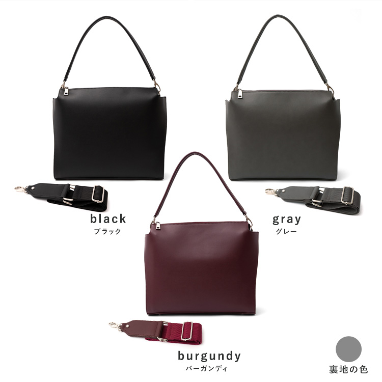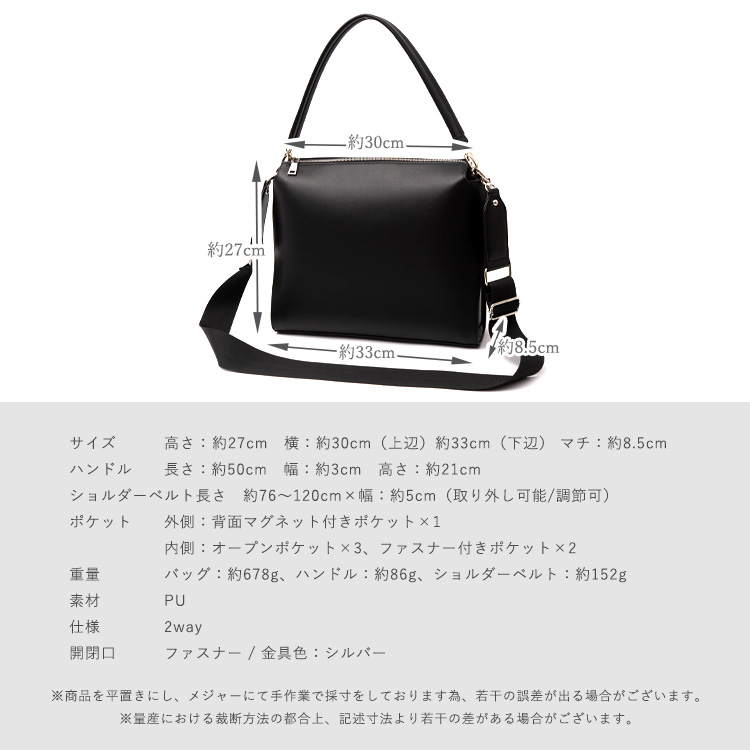 | サイズ | ●SIZE:高さ:約27cm / 幅:約30cm(上辺)約33cm(下辺) / マチ:約8.5cm ●ハンドル長さ:約50cm×幅:約3cm、持ち手高さ:約21cm ●ショルダーベルト長さ:約76~120cm×幅:約5cm(取り外し可能/調節可) ●外ポケット:背面マグネット付きポケット1 ●内ポケット:オープンポケット3、ファスナー付きポケット2 ●ハンドル重量:約86g ●ショルダーベルト重量:約152g ●バッグのみ重量:約678g ●素材:PU ●仕様:2way ●バッグのメイン開閉口はファスナーになっております。 ●金具色:シルバー |