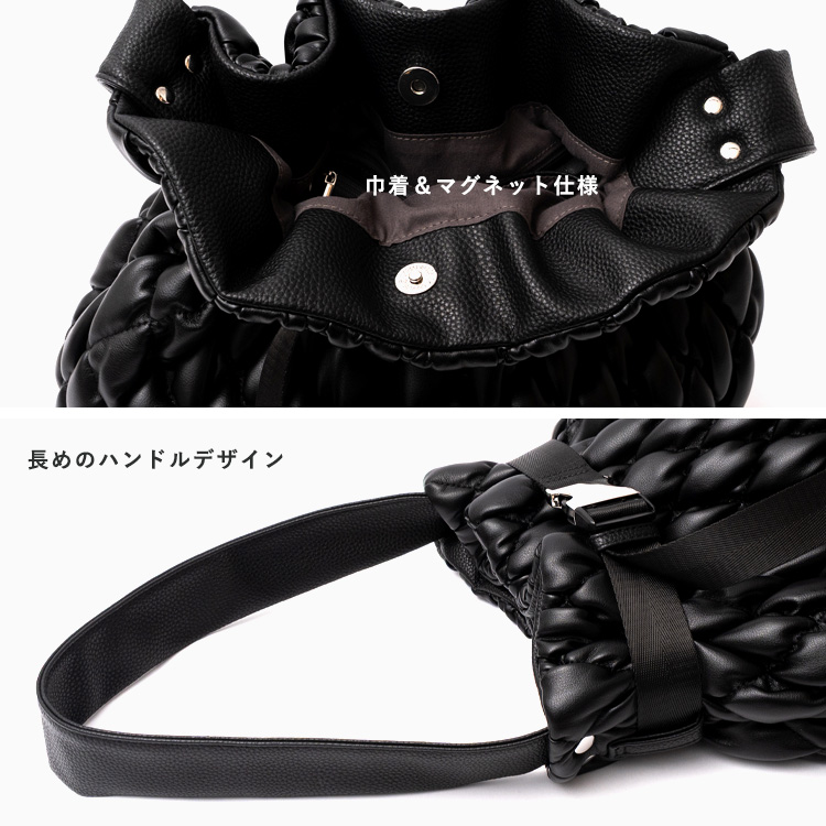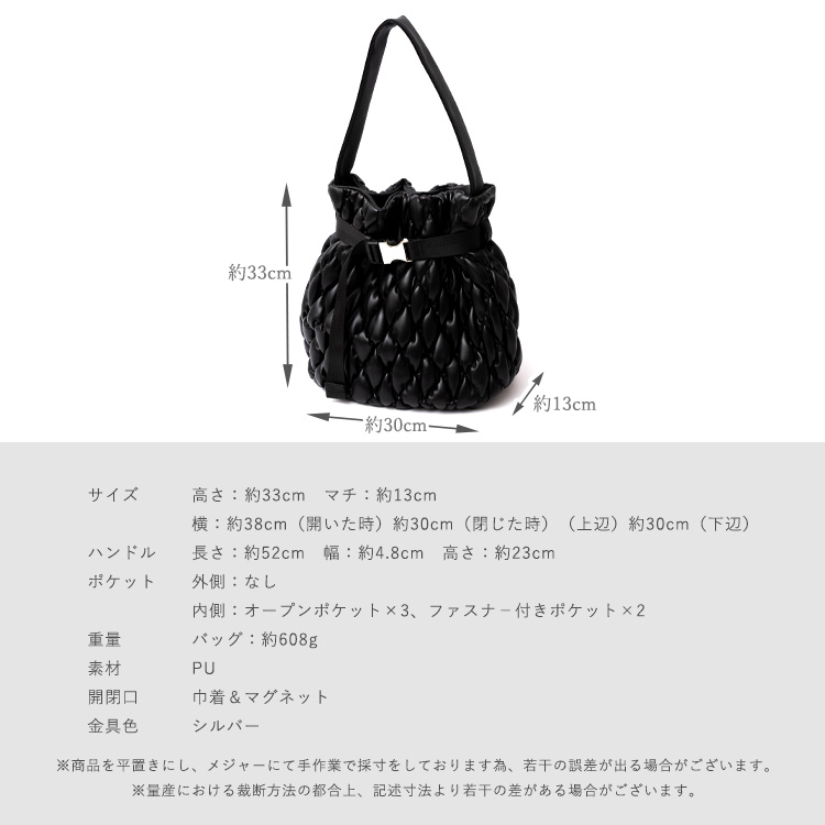 | サイズ | ●SIZE:高さ:約33cm / 幅:約38cm(開いた時)約30cm (閉じた時)(上辺)約30cm(下辺) / マチ:約13cm ●ハンドル長さ:約52cm×幅:約4.8cm、持ち手高さ:約23cm ●外ポケット:なし ●内ポケット:オープンポケット3、ファスナー付きポケット2 ●バッグのみ重量:約608g ●素材:PU ●バッグのメイン開閉口は巾着&マグネットになっております。 ●金具色:シルバー |