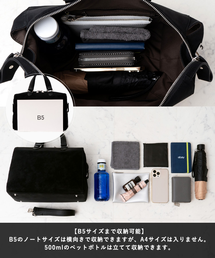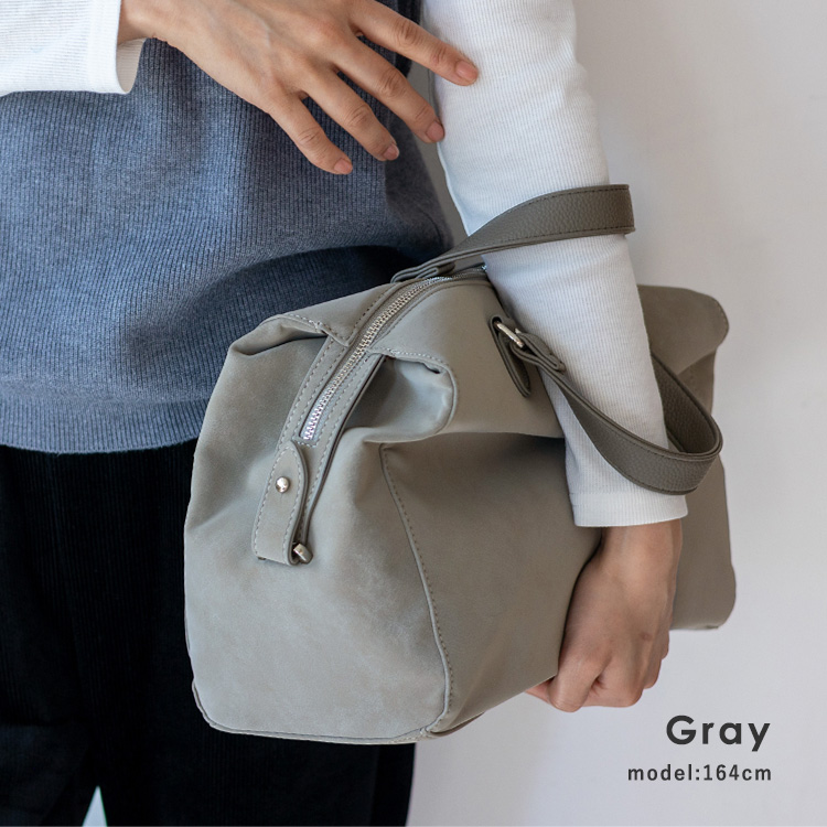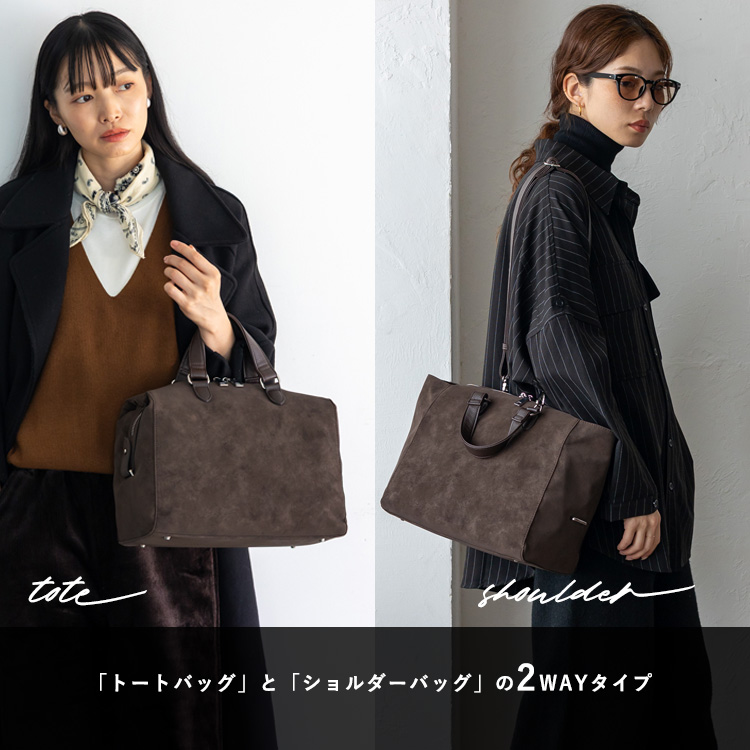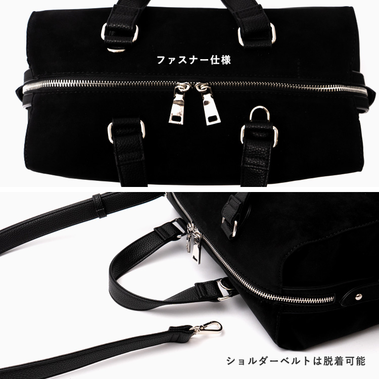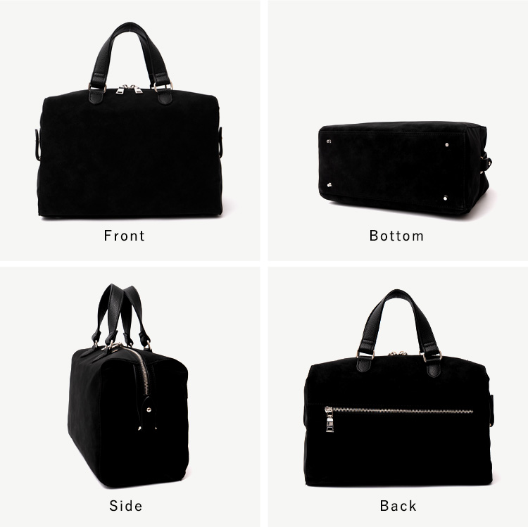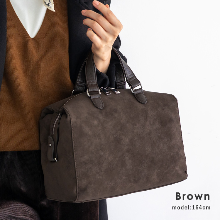 流行りのスエード風素材を使用した、上品見えのスクエア型ボストンバッグ。