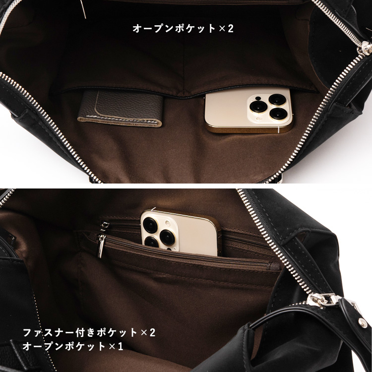 ハンドル付きで手持ちはもちろん、ショルダーストラップを使えば肩掛けや斜め掛けにも対応可能。シーンやスタイルに合わせて使い分けられる便利な2WAY仕様です。