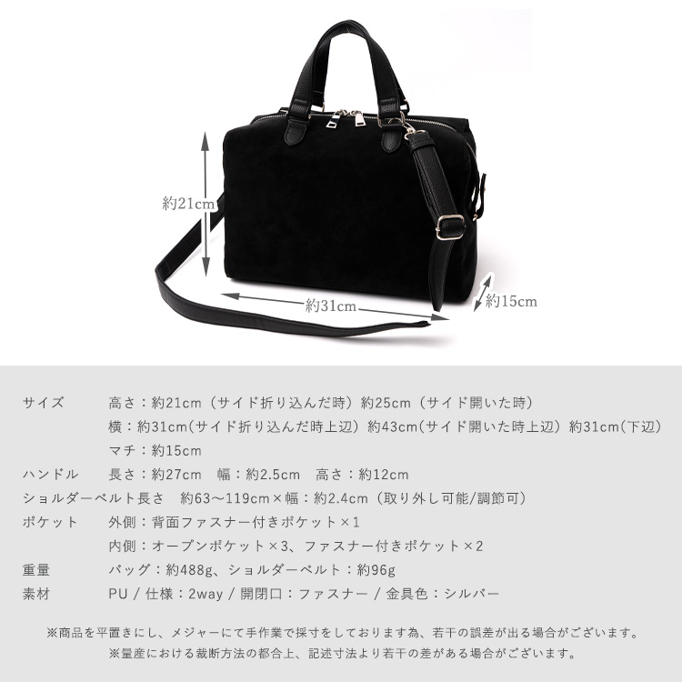 | サイズ | ●SIZE:高さ:約21cm(サイド折り込んだ時)約25cm(サイド開いた時) / 幅:約31cm (サイド折り込んだ時上辺)約43cm(サイド開いた時上辺)約31cm(下辺) / マチ:約15cm ●ハンドル長さ:約27cm×幅:約2.5cm、持ち手高さ:約12cm ●ショルダーベルト長さ:約63~119cm×幅:約2.4cm(取り外し可能/調節可) ●外ポケット:背面ファスナー付きポケット1 ●内ポケット:オープンポケット3、ファスナー付きポケット2 ●ショルダーベルト重量:約96g ●バッグのみ重量:約488g ●素材:PU ●仕様:2way ●バッグのメイン開閉口はファスナーになっております。 ●金具色:シルバー |