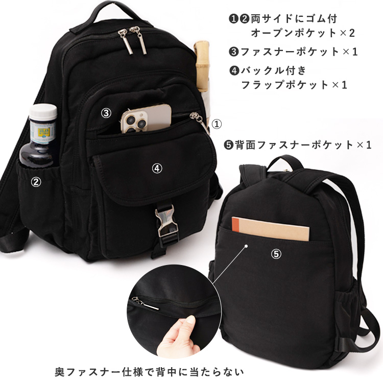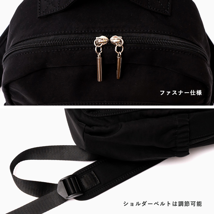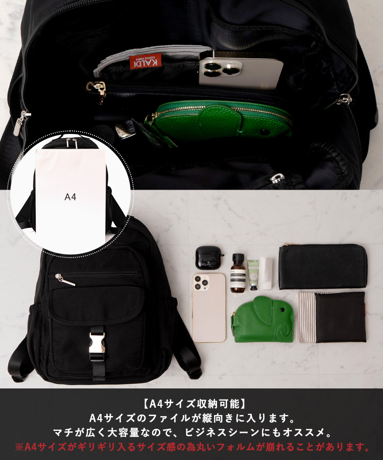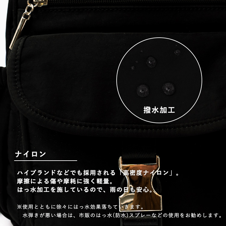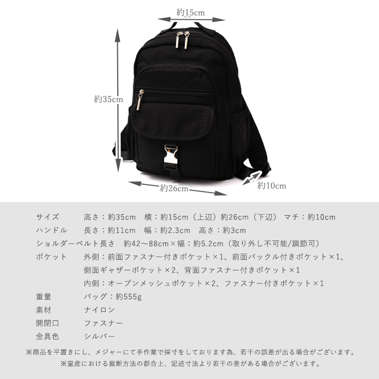 | サイズ | ●SIZE:高さ:約35cm / 幅:約15cm(上辺)約26cm(下辺) / マチ:約10cm ●ハンドル長さ:約11cm×幅:約2.3cm、持ち手高さ:約3cm ●ショルダーベルト長さ:約42~88cm×幅:約5.2cm(取り外し不可能/調節可) ●外ポケット:前面ファスナー付きポケット1、前面バックル付きポケット1、側面ギャザーポケット2、背面ファスナー付きポケット1 ●内ポケット:オープンメッシュポケット2、ファスナー付きポケット1 ●バッグ重量:約555g ●素材:ナイロン ●バッグのメイン開閉口はファスナーになっております。 ●金具色:シルバー |