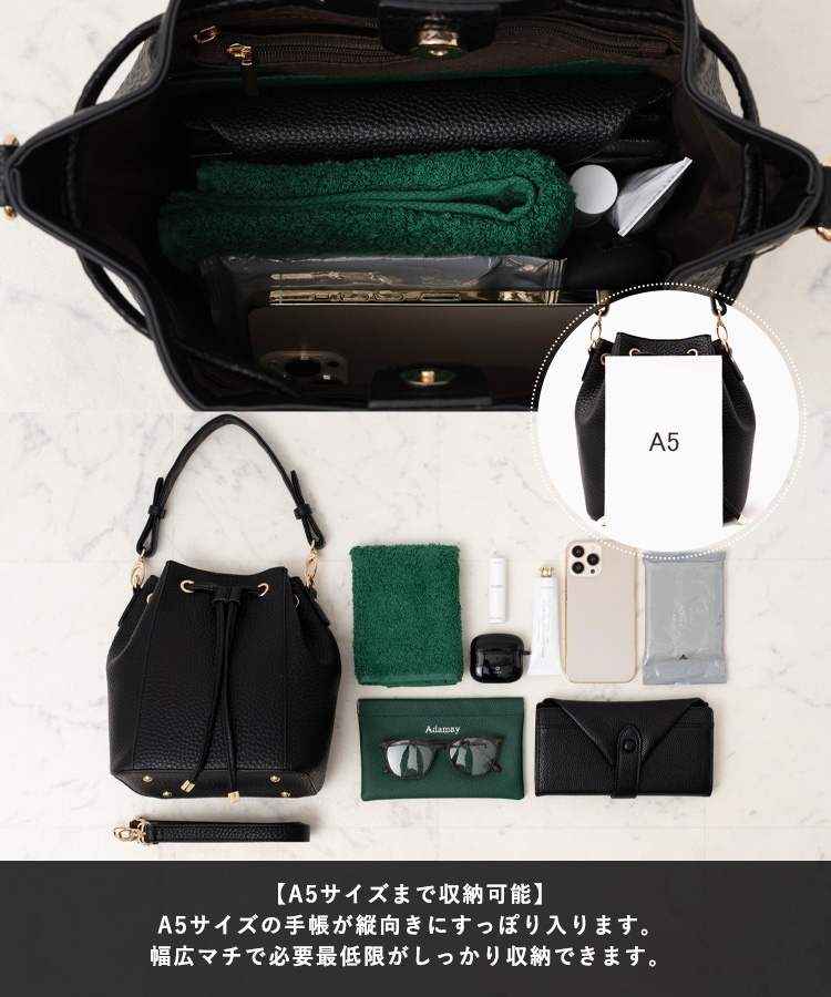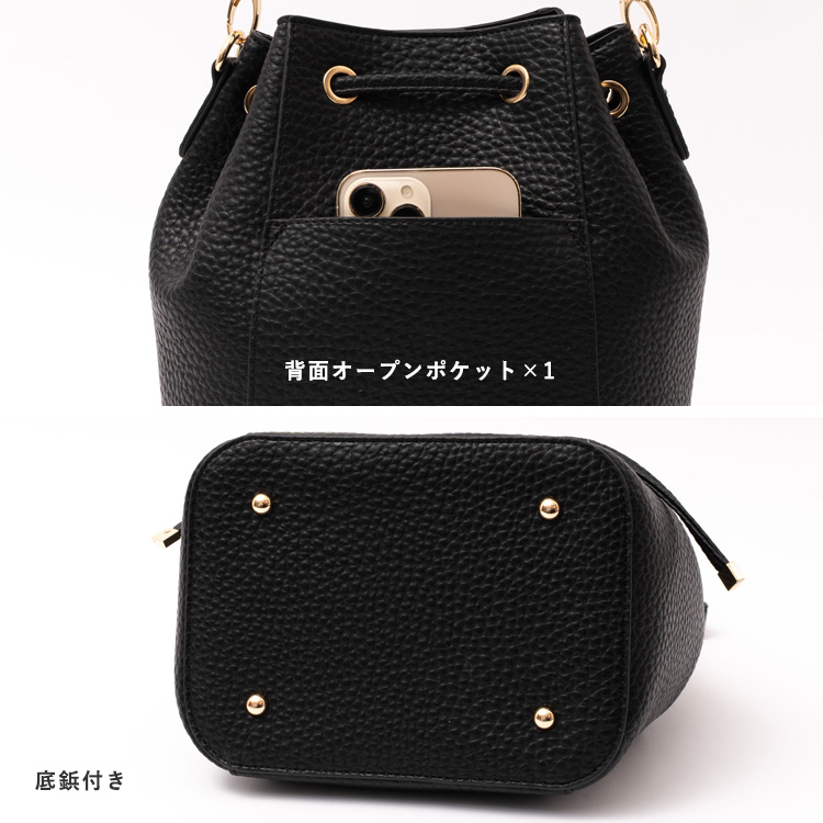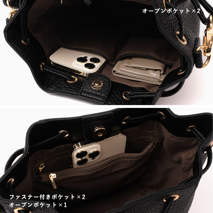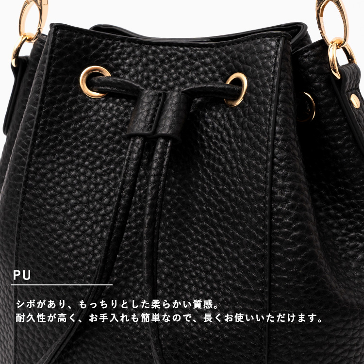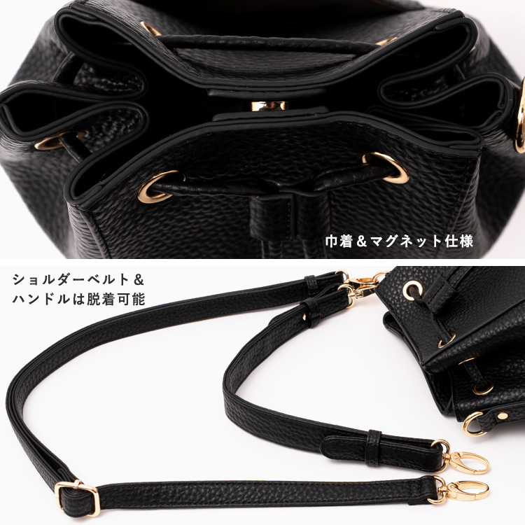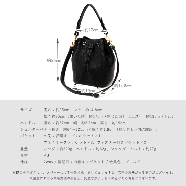 | サイズ | ●SIZE:高さ:約25cm / 幅:約30cm(開いた時)約17cm (閉じた時)(上辺)約19cm(下辺) / マチ:約14.8cm ●ハンドル長さ:約37cm×幅:約2.8cm、持ち手高さ:約19cm ●ショルダーベルト長さ:約64~121cm×幅:約1.8cm(取り外し可能/調節可) ●外ポケット:背面オープンポケット1 ●内ポケット:オープンポケット3、ファスナー付きポケット2 ●ハンドル重量:約62g ●ショルダーベルト重量:約77g ●バッグのみ重量:約320g ●素材:PU ●仕様:2way ●バッグのメイン開閉口は巾着&マグネットになっております。 ●金具色:ゴールド |