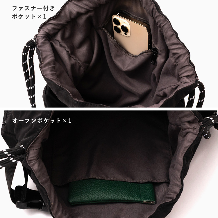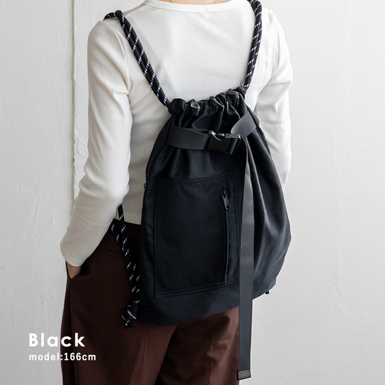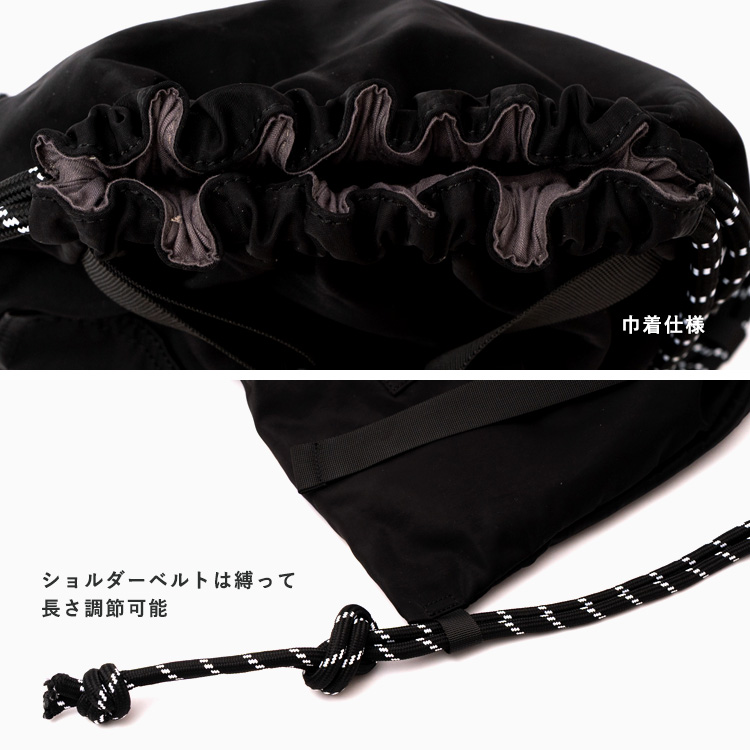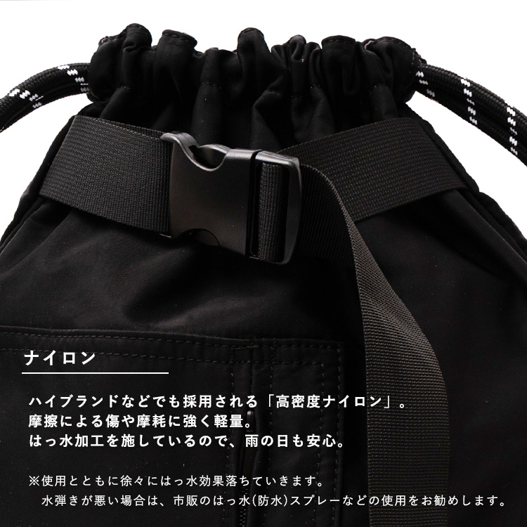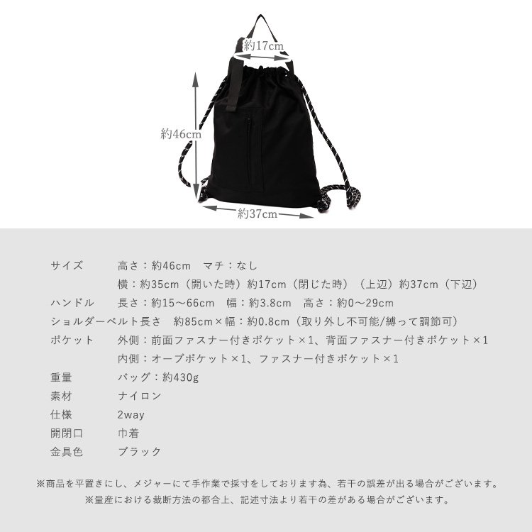 | サイズ | ●SIZE:高さ:約46cm / 幅:約35cm(開いた時)約17cm(閉じた時)(上辺)約37cm(下辺) / マチ:なし ●ハンドル長さ:約15~66cm×幅:約3.8cm、持ち手高さ:約0~29cm ●ショルダーベルト長さ:約85cm×幅:約0.8cm(取り外し不可能/縛って調節可) ●外ポケット:前面ファスナー付きポケット1、背面ファスナー付きポケット1 ●内ポケット:オープンポケット1、ファスナー付きポケット1 ●バッグのみ重量:約430g ●素材:ナイロン ●仕様:2way ●バッグのメイン開閉口は巾着になっております。 ●金具色:ブラック |