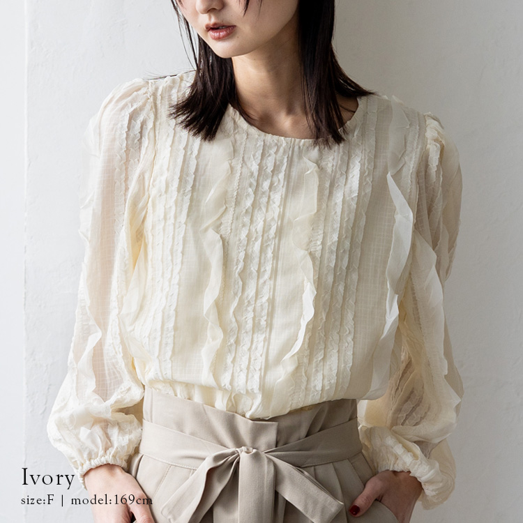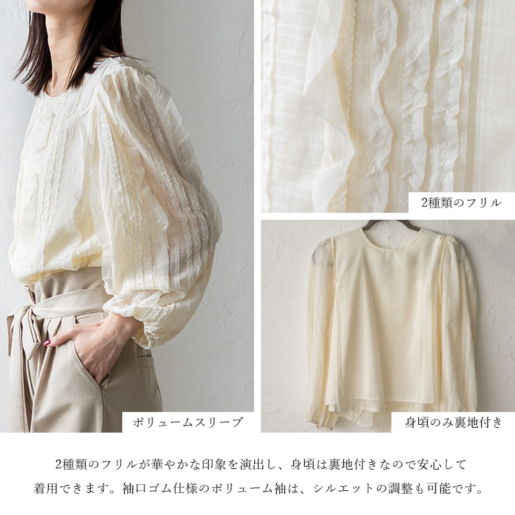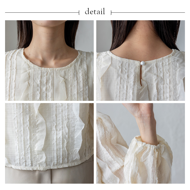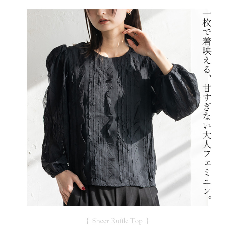ランダムにあしらわれたフリルが目を惹く、華やかさと上品さを兼ね備えたシアートップス。