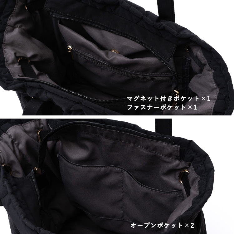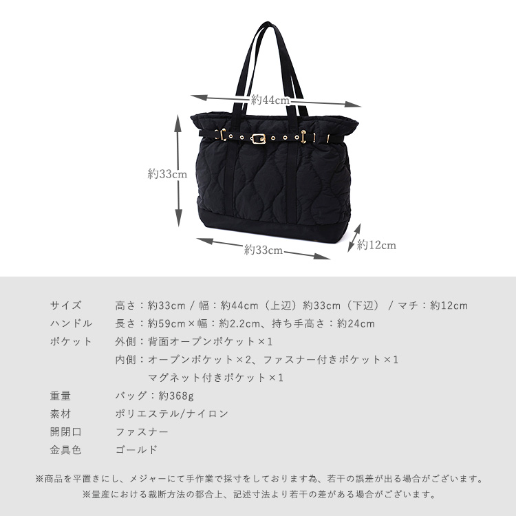 | サイズ | ●SIZE:高さ:約33cm / 幅:約44cm(上辺)約33cm(下辺) / マチ:約12cm ●ハンドル長さ:約59cm×幅:約2.2cm、持ち手高さ:約24cm ●外ポケット:背面オープンポケット1 ●内ポケット:オープンポケット2、ファスナー付きポケット1、マグネット付きポケット1 ●バッグのみ重量:約368g ●素材:ポリエステル/ナイロン ●バッグのメイン開閉口はファスナーになっております。 ●金具色:ゴールド |