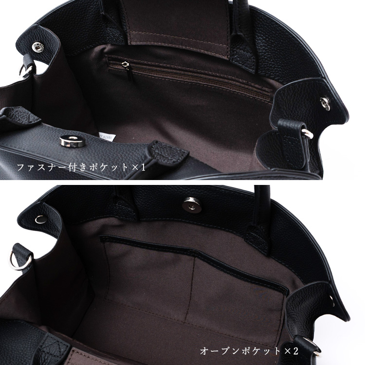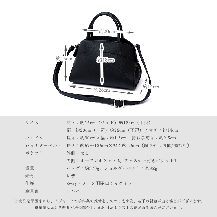 | サイズ | ●SIZE:高さ:約15cm(サイド)約18cm(中央) / 幅:約20cm(上辺)約26cm(下辺) / マチ:約14cm ●ハンドル長さ:約30cm×幅:約1.3cm、持ち手高さ:約9.5cm ●ショルダーベルト長さ:約67~126cm×幅:約1.6cm(取り外し可能/調節可) ●外ポケット:なし ●内ポケット:オープンポケット2、ファスナー付きポケット1 ●ショルダーベルト重量:約92g ●バッグのみ重量:約370g ●素材:本革(牛革) ●仕様:2way ●バッグのメイン開閉口はマグネットになっております。 ●金具色:シルバー |