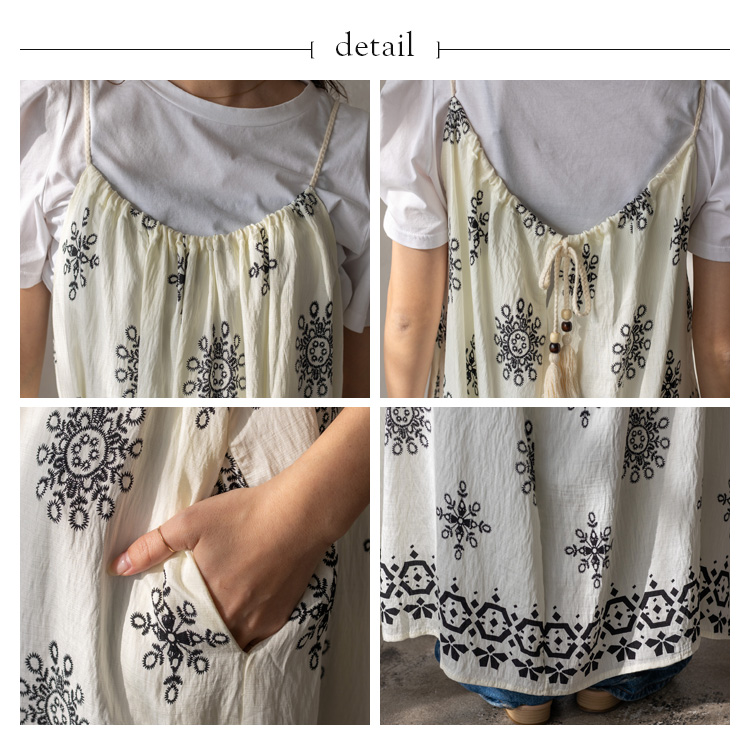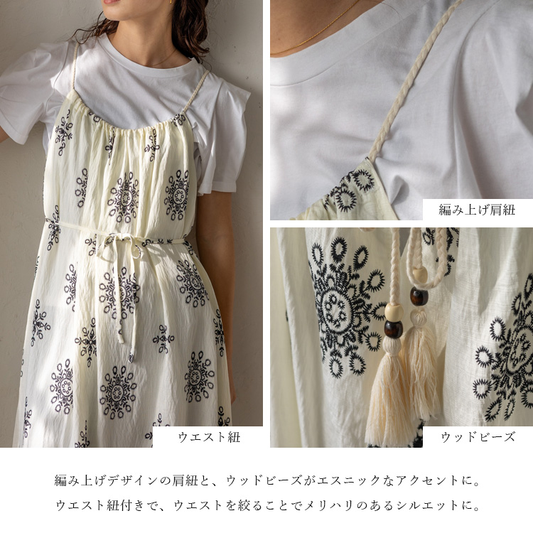 編み上げデザインの肩紐と、さりげなくあしらったウッドビーズがエスニックなアクセントに。