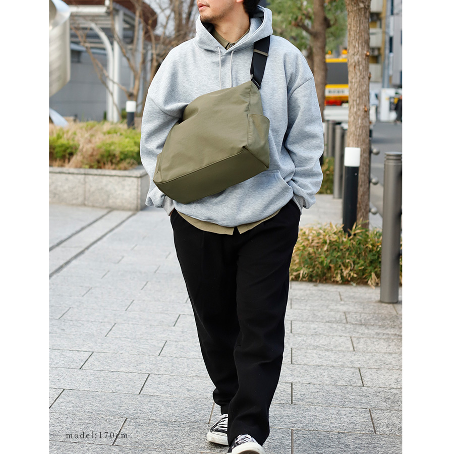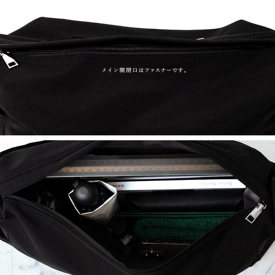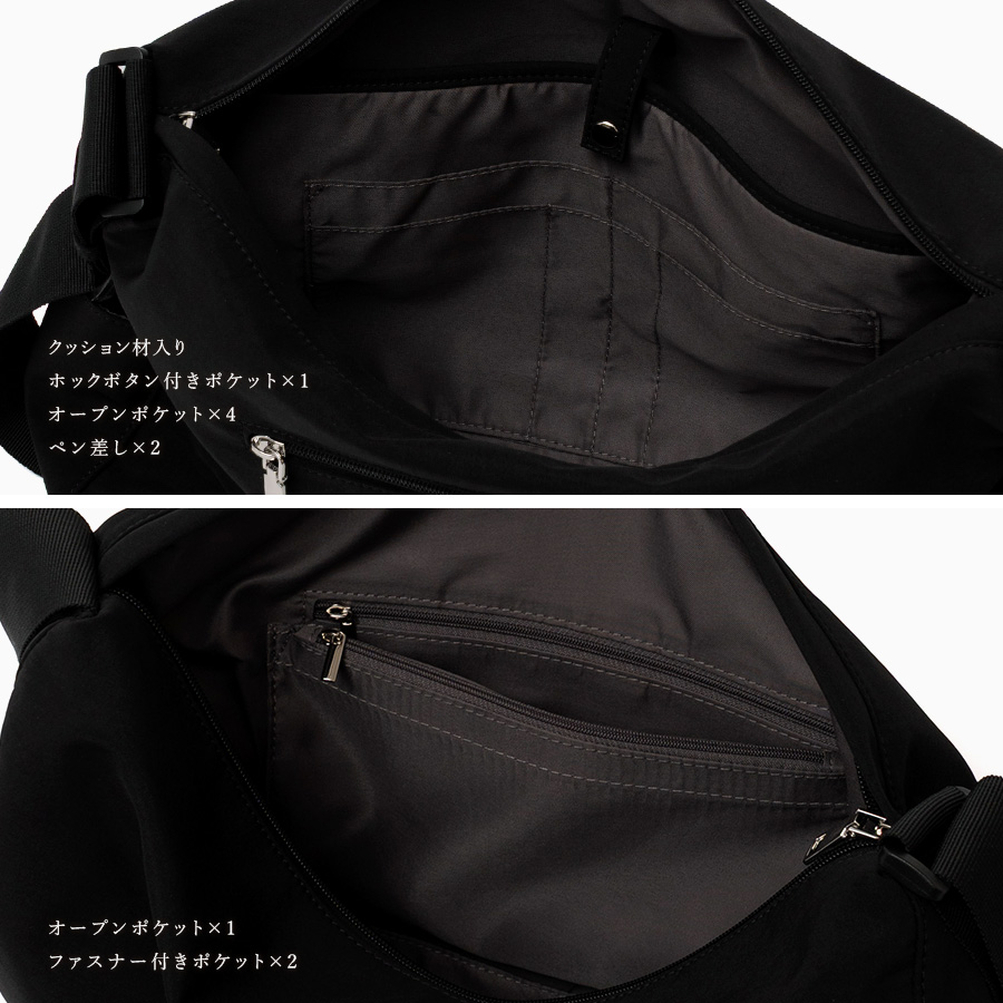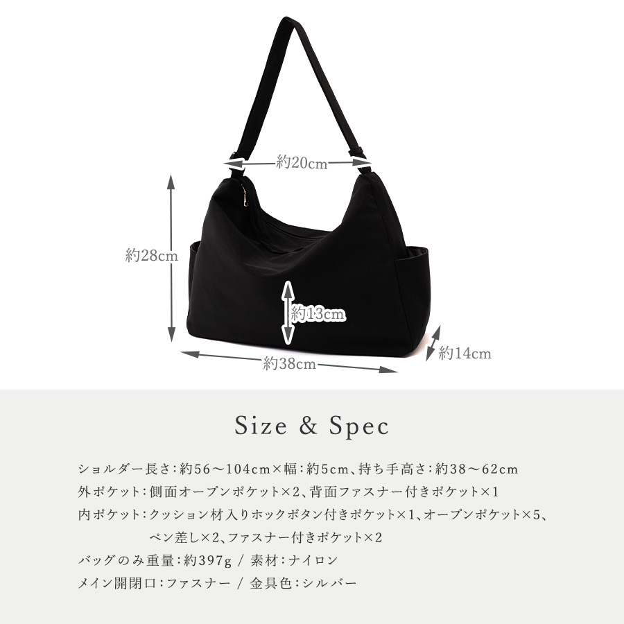 | サイズ | ●SIZE:高さ:約28cm(サイド)約13cm(中央) / 幅:約20cm(上辺)約38cm(下辺) / マチ:約14cm ●ショルダー長さ:約56~104cm×幅:約5cm、持ち手高さ:約38~62cm ●外ポケット:側面オープンポケット2、背面ファスナー付きポケット1 ●内ポケット:クッション材入りホックボタン付きポケット1、オープンポケット5、ペン差し2、ファスナー付きポケット2 ●バッグのみ重量:約397g ●素材:ナイロン ●バッグのメイン開閉口はファスナーになっております。 ●金具色:シルバー |