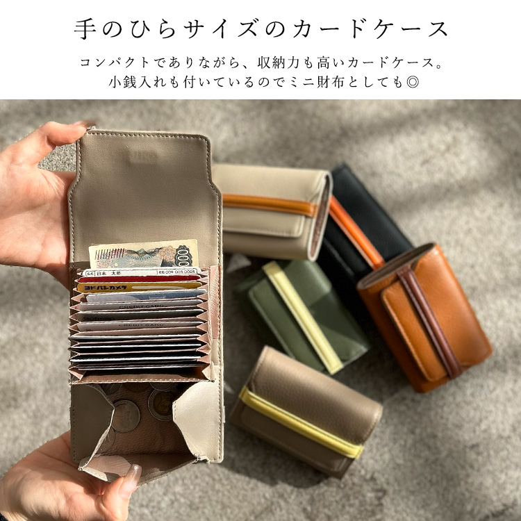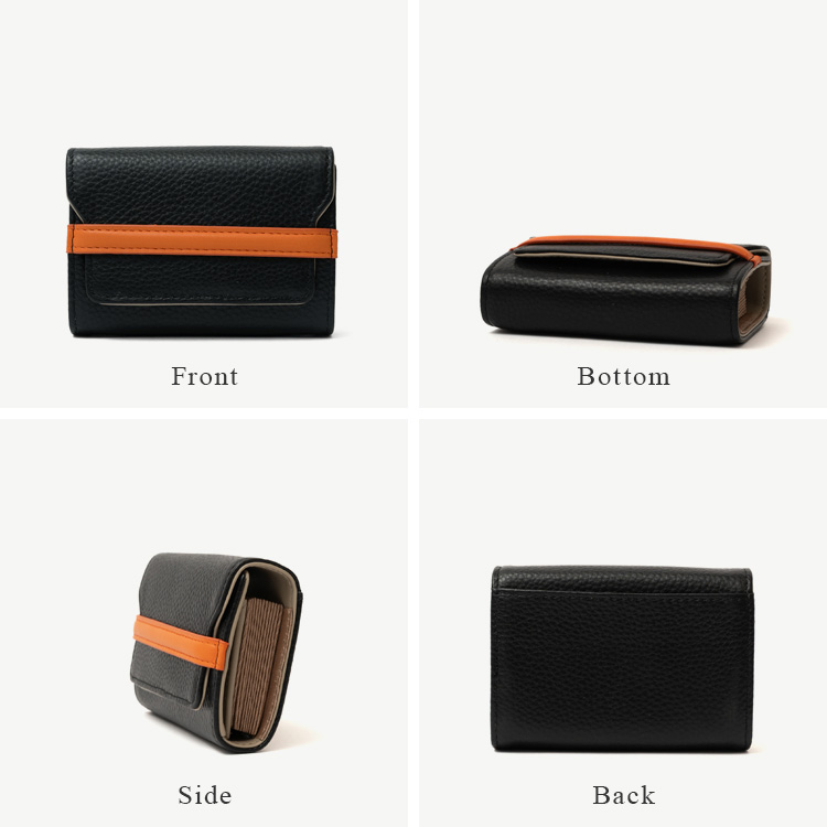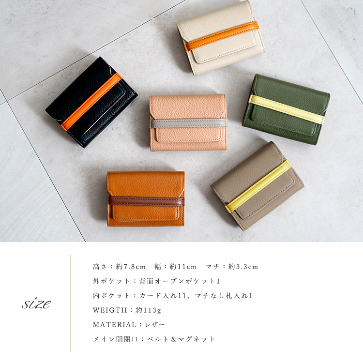 | サイズ | ●SIZE:縦:約7.8cm 横:約11cm 厚み:約3.3cm ●外ポケット:背面オープンポケット1 ●内ポケット:カード入れ11、小銭入れ1、マチなし札入れ1 ●重さ:約113g ●素材:本革(牛革) ●メイン開閉口はベルト&マグネットになっております。 |