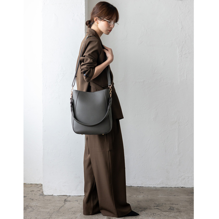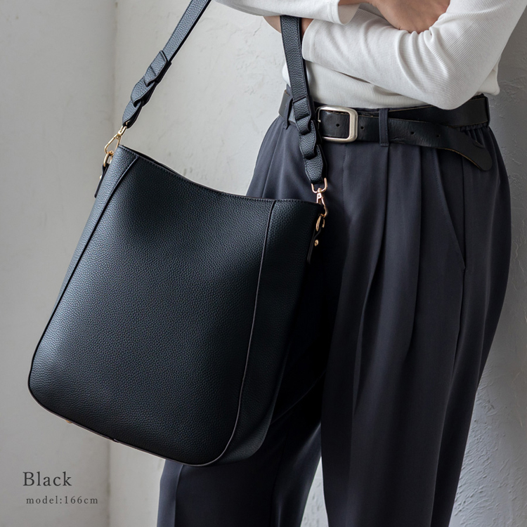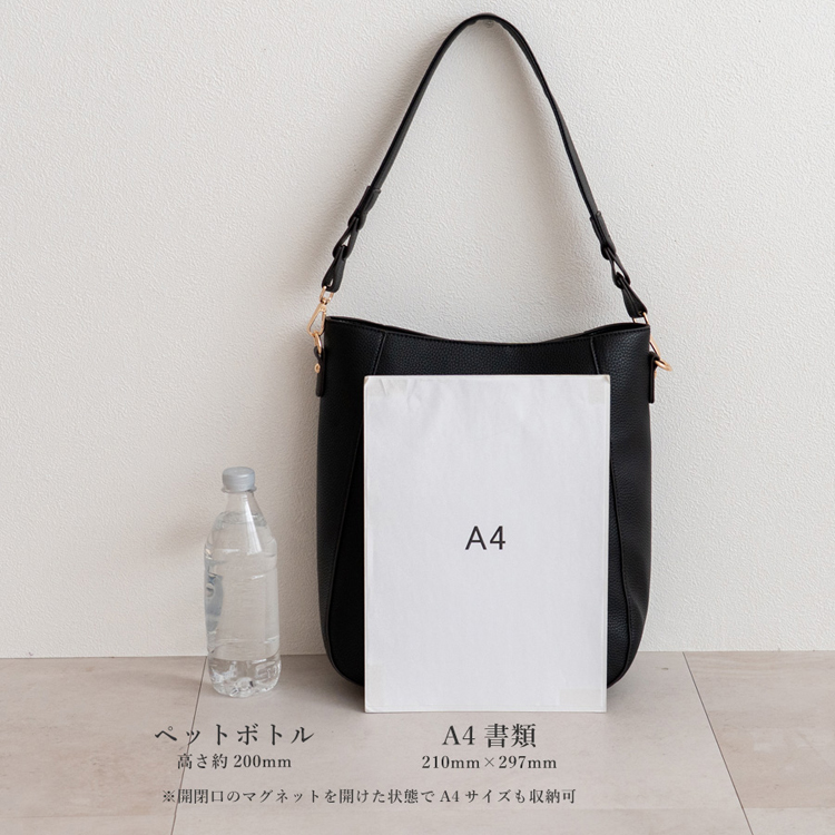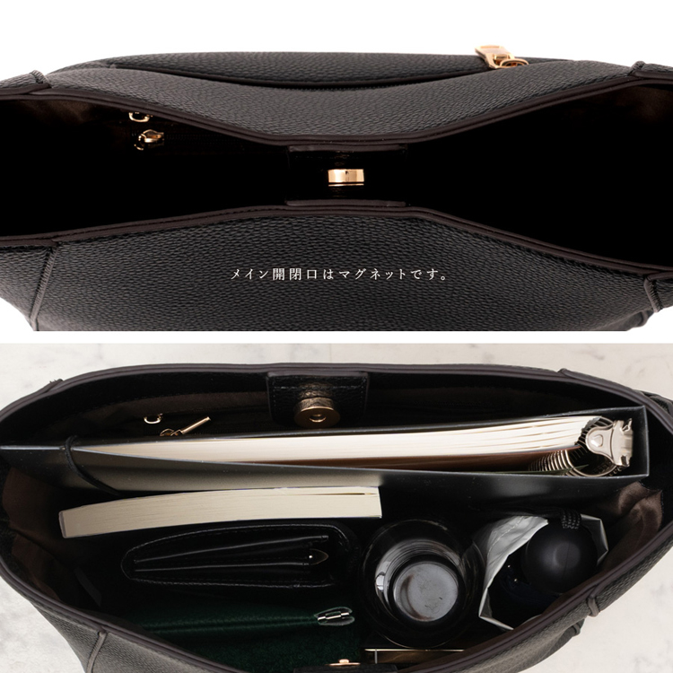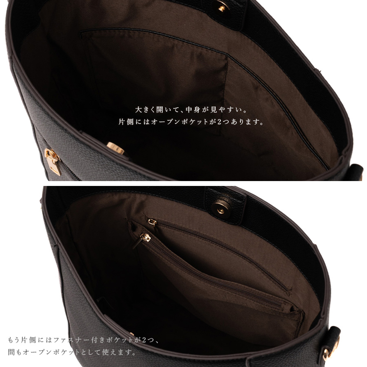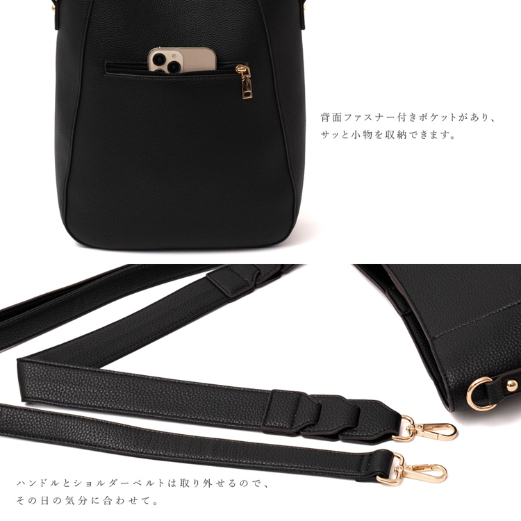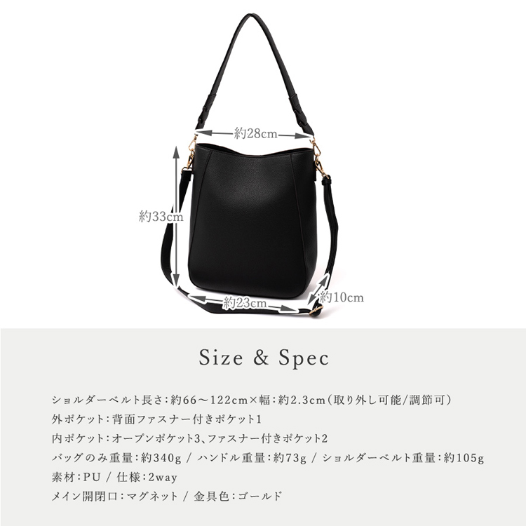 | サイズ | ●SIZE:高さ:約33cm / 幅:約28cm(上辺)約23cm(下辺) / マチ:約10cm ●ハンドル長さ:約60cm×幅:約3.3cm、持ち手高さ:約29cm ●ショルダーベルト長さ:約66~122cm×幅:約2.3cm(取り外し可能/調節可) ●外ポケット:背面ファスナー付きポケット1 ●内ポケット:オープンポケット3、ファスナー付きポケット2 ●ハンドル重量:約73g ●ショルダーベルト重量:約105g ●バッグのみ重量:約340g ●素材:PU ●仕様:2way ●バッグのメイン開閉口はマグネットになっております。 ●金具色:ゴールド |