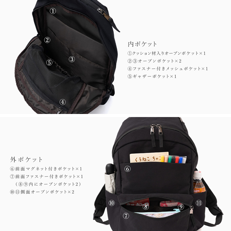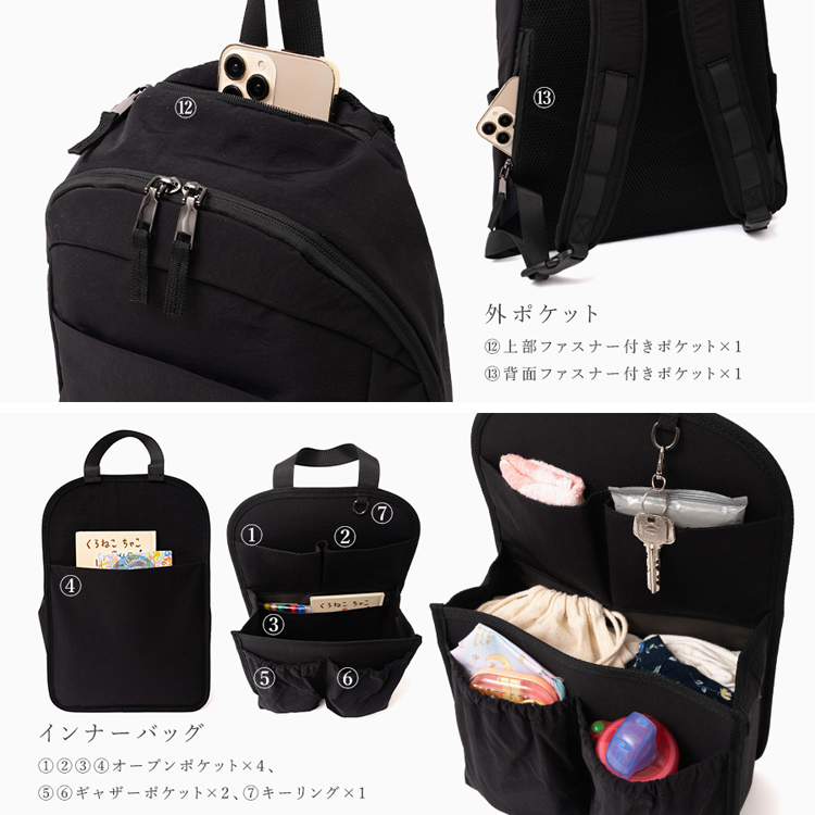 インナーバッグ付き×計19ポケットで、毎日のお出かけを快適にサポートするマザーズリュックです。
