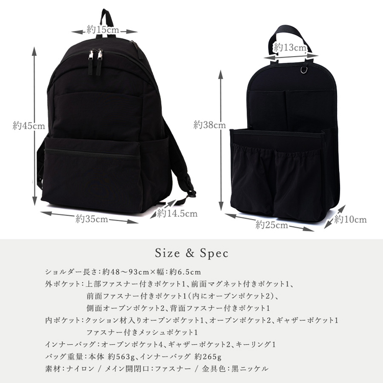 | サイズ | サイズ ●高さ:約45cm / 幅:約15cm(上辺)約35cm(下辺) / マチ:約14.5cm ハンドル ●長さ:約22cm / 幅:約2.4cm / 持ち手高さ:約7.5cm ショルダーベルト ●長さ:約48~93cm / 幅:約6.5cm / 取り外し不可能/長さ調節可能 素材・仕様 ●素材:ナイロン ●開閉:ファスナー ●仕様:インナーバッグ付き ●金具:黒ニッケル ●裏地カラー:茶 ポケット・重量 ●外側:上部ファスナー付きポケット×1 前面マグネット付きポケット×1 前面ファスナー付きポケット×1(内にオープンポケット×2) 側面オープンポケット×2 背面ファスナー付きポケット×1 ●内側:クッション材入りオープンポケット×1 オープンポケット×2 ファスナー付きメッシュポケット×1 ギャザーポケット×1 ●重量:本体 約563g ■インナーバッグ サイズ ●高さ:約38cm / 幅:約13cm(上辺)約25cm(下辺) / マチ:約10cm ハンドル ●長さ:約26cm / 幅:約2.5cm / 持ち手高さ:約11cm 素材・仕様 ●素材:ナイロン ポケット・重量 ●外側:前面ギャザーポケット×2、背面オープンポケット×1 ●内側:オープンポケット×3、キーリング×1 ●重量:約265g |
