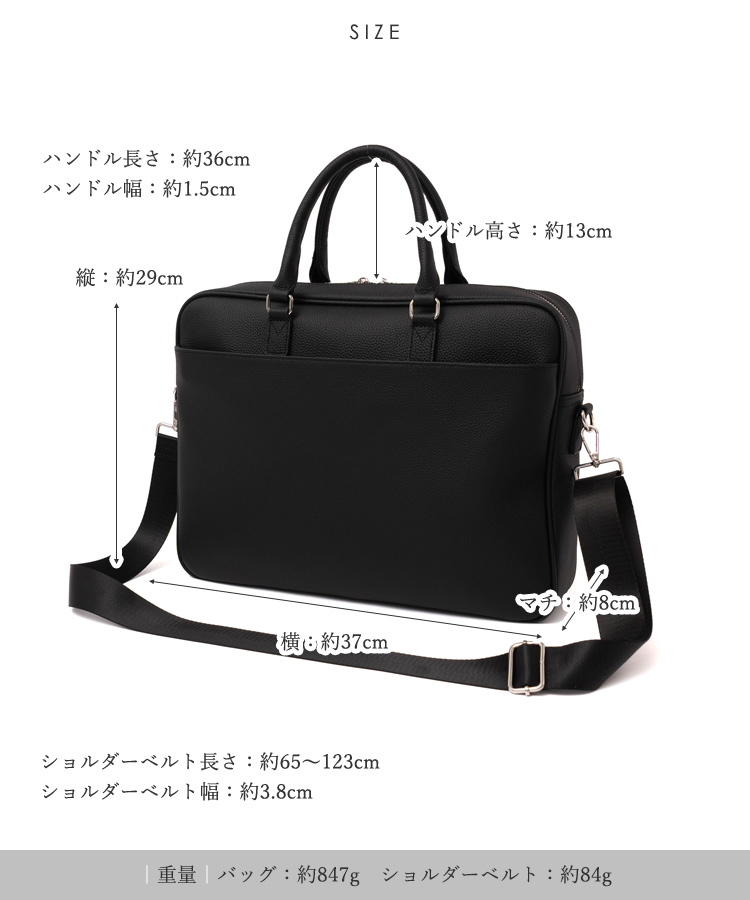 | サイズ | サイズ ・高さ:約29cm ・幅:約37cm ・マチ:約8cm ハンドル ・長さ:約36cm ・幅:約1.5cm ・持ち手高さ:約13cm ショルダーベルト ・長さ:約65~123cm ・幅:約3.8cm ・取り外し可能/長さ調節可能 素材・仕様 ・素材:レザー(牛革) ・開閉:ファスナー ・仕様:2way ・金具:シルバー ・裏地カラー:ブラウン ポケット・重量 ・外側:前面ファスナーポケット×1、背面ファスナーポケット×1 ・内側:オープンポケット×2、クッション材入りホックボタン付きポケット×1 ・重量:本体 約847g/ショルダー 約84g |