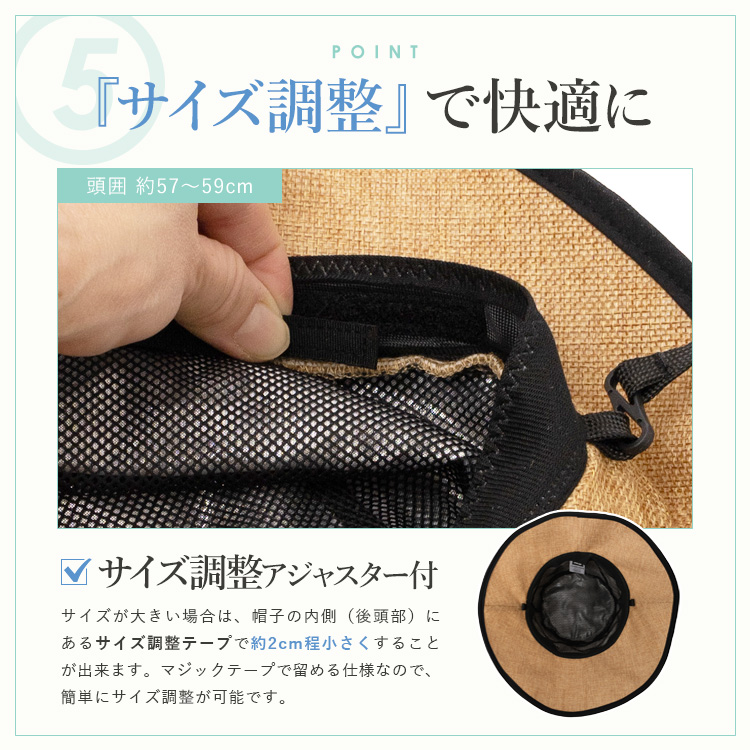 | サイズ | ・頭囲:約57cm(最小)約59cm(最大) ※サイズ調整マジックテープ付き 素材・仕様 ・素材:ポリエステル100% ・つばの長さ:約11cm(前)約8cm(後) ・帽子の深さ:約9.5cm ・重量:83g ※取り外し可能なあご紐付き、サイズ調整可能 |